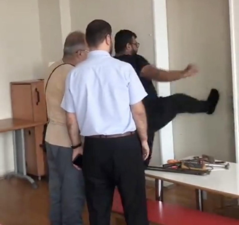 Görüntülerde, Mahmut Celalettin Ökten İmam Hatip Ortaokul Müdürü Ergin Kaya Kırbıyık, yardımcısı olan kadın öğretmenin kapısını tekmeleyerek kırdırıyor.