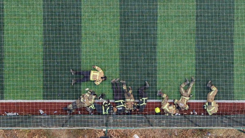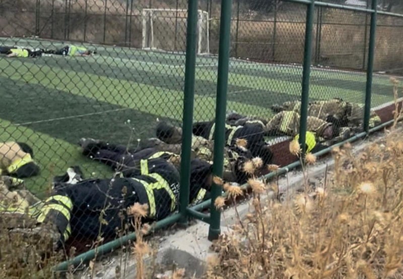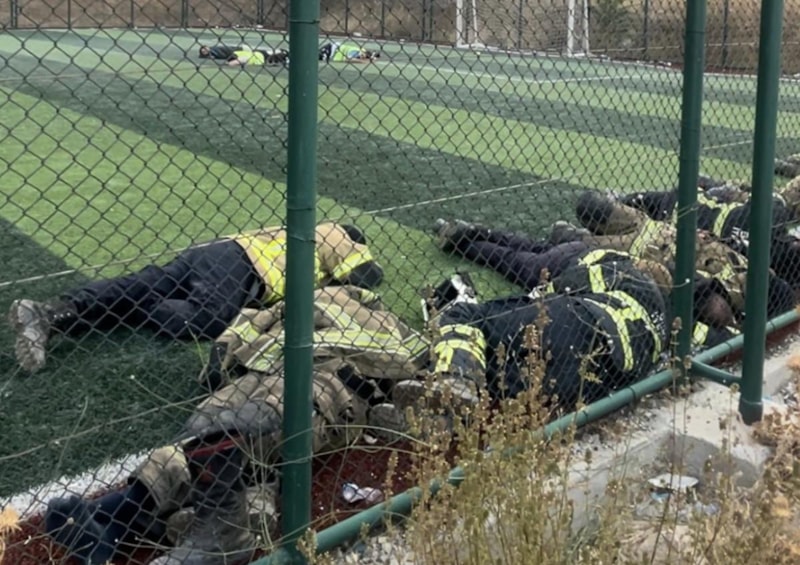 Üç ilçeyi etkileyen ve 3 köyün boşaltılmasına sebep olan yangında, 12 saat boyunca fedakarca çalışan ve ormanın derinliklerine girip alevleri bastıran itfaiye erleri, halı sahada dinlendi. Zor şartlar altında birkaç saatliğine dinlenerek göreve hazırlanan erler, dikkat çeken görüntüler oluşturdu.
