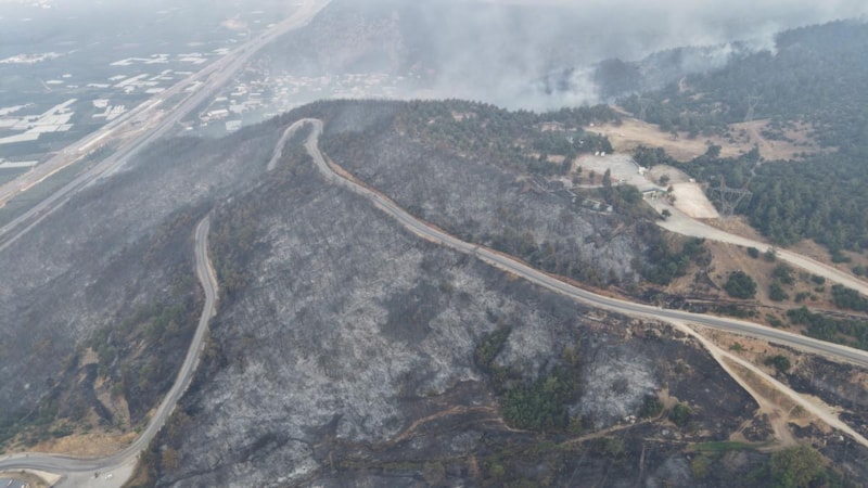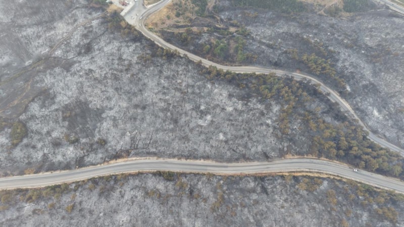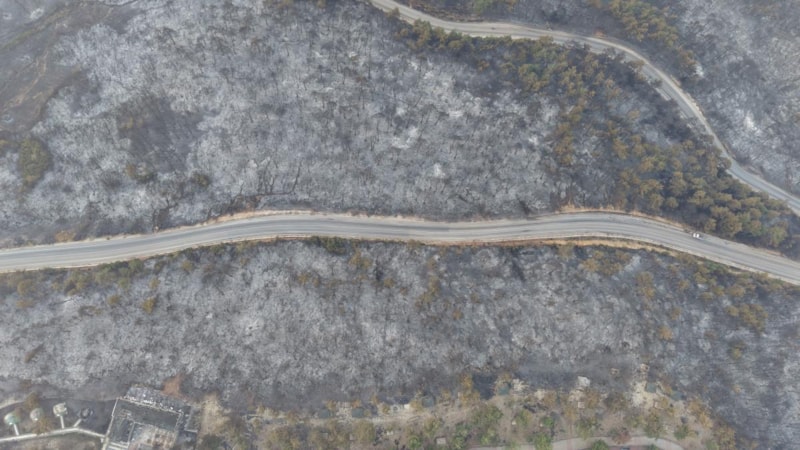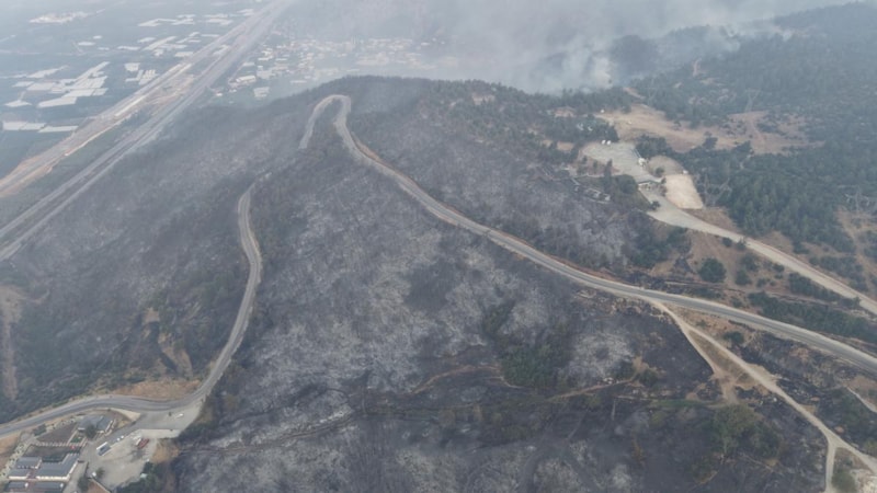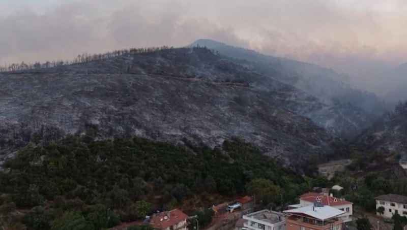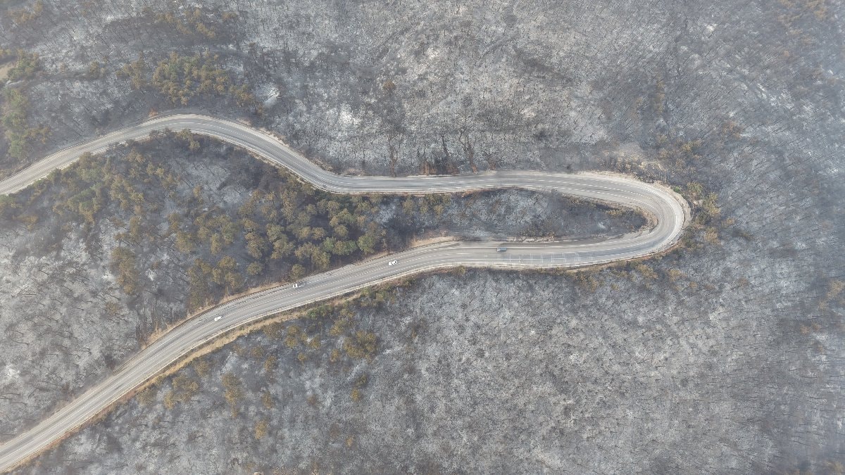 İğdir ve Narlıdere köylerinde drone görüntüleri, çamla bezeli ormanlık alanın griye döndüğünü gösteriyor.