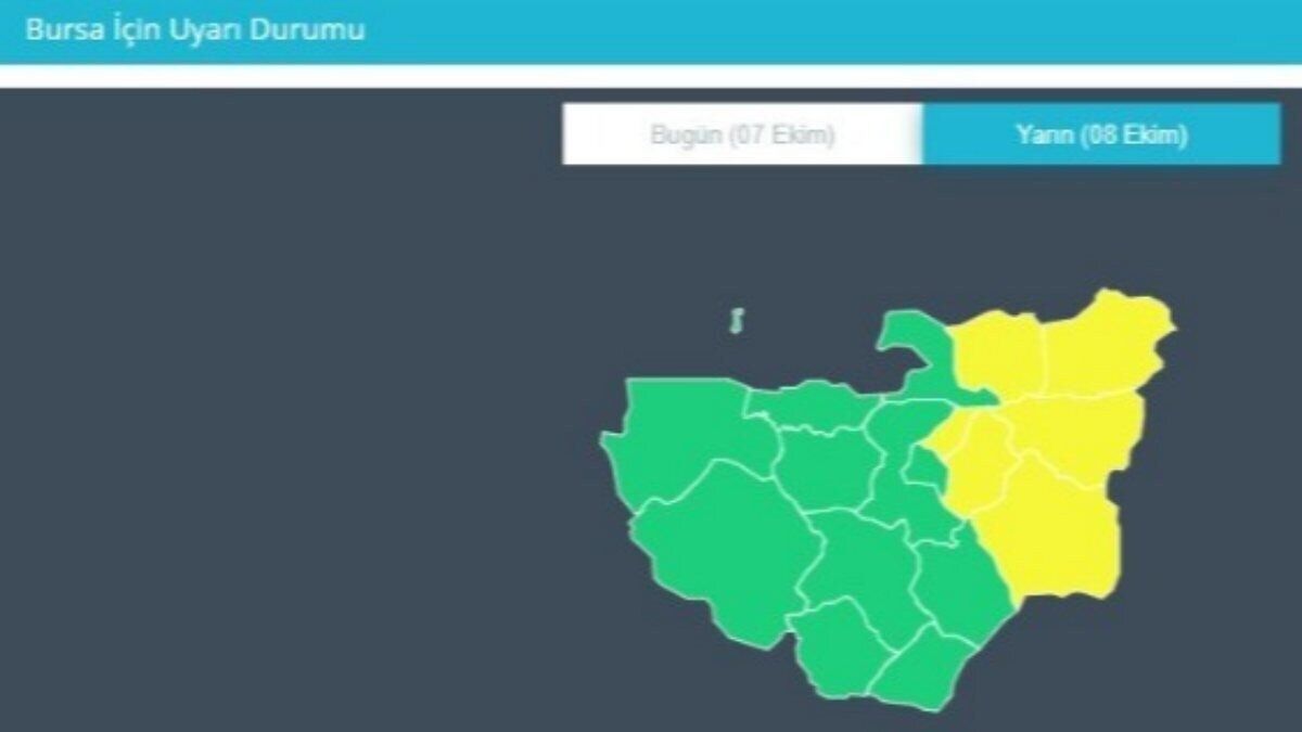 İHA'dan edinilen bilgiye göre; uyarılar üzerine Bursa’nın 6 ilçesi, haritada sarı renk ile işaretlendi.