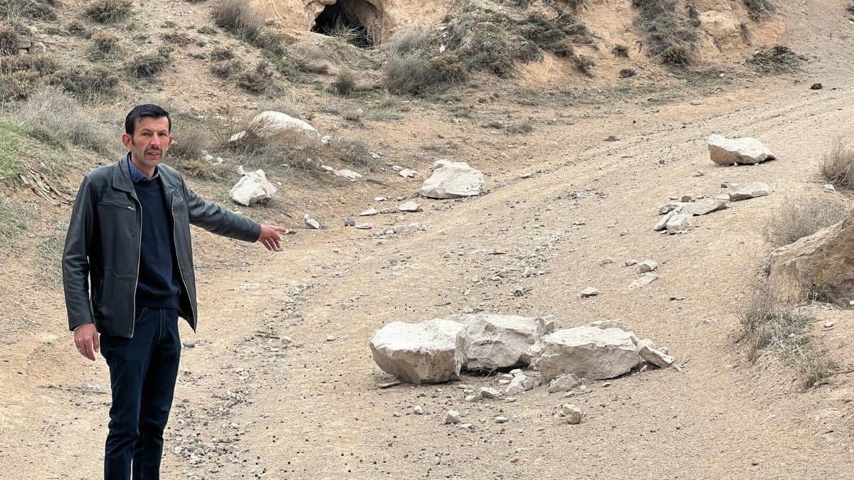 Şahinefendi Köyü Muhtarı Fatih Mehmet Çınar da köylerinde bulunan dağdan kopan kaya parçaları nedeniyle tedirgin olduklarını söyledi.