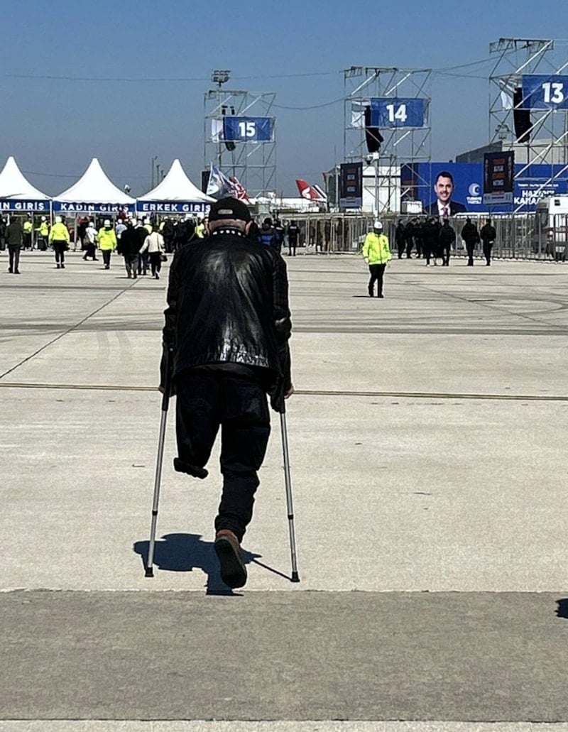 O karede bir ayağı olmayan vatandaşın miting alanına doğru koltuk değnekleriyle hareket ettiği görüldü.