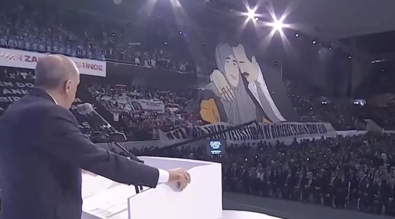 AK Parti büyük kongresinde, Cumhurbaşkanı Recep Tayyip Erdoğan ve annesi Tenzile Erdoğan'ın resminin çizildiği bir koreografi gösterisi gerçekleştirildi.