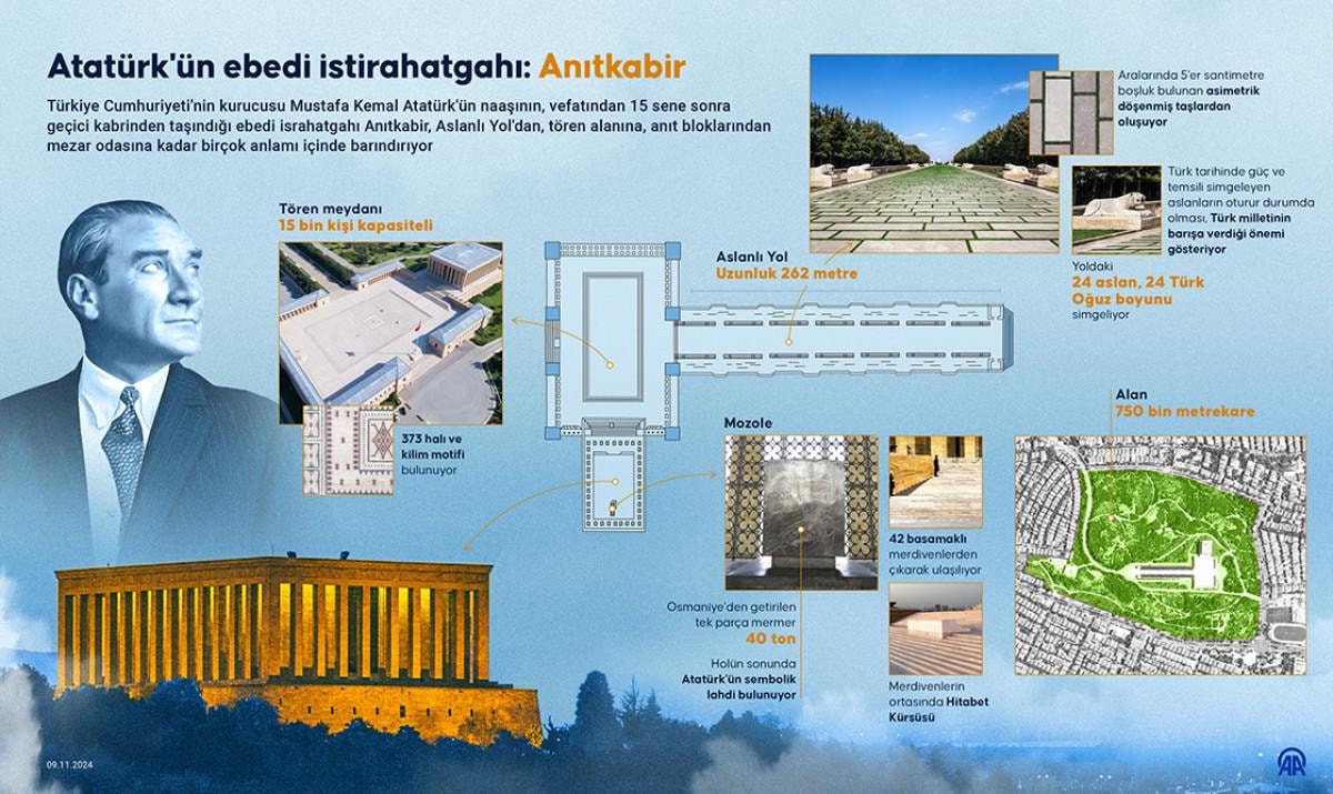 "Benim naçiz vücudum elbet bir gün toprak olacaktır, fakat Türkiye Cumhuriyeti ilelebet payidar kalacaktır." diyen Atatürk, ebedi istirahatgahı olan Türkiye'nin kalbi Anıtkabir'de, Türk milletinin gönlünde yaşamaya devam ediyor.