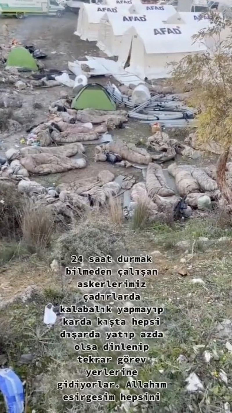 Sosyal medyaya yansıya görüntülerde AFAD çadırlarının yanında arama kurtarma çalışmalarına ara veren askerlerimizin uyku tulumları içinde dinlendikleri görüldü.