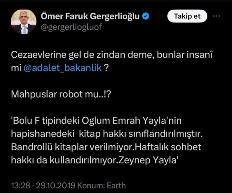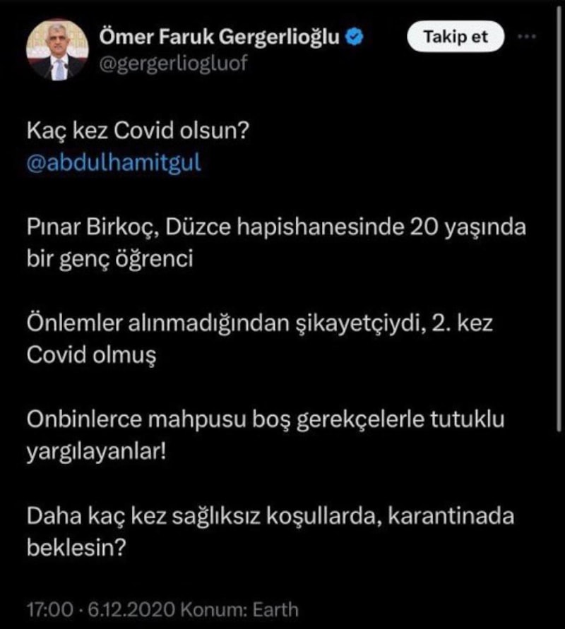 Gergerlioğlu’nun toplantıda, “Bize daha önceden de başvuran Düzce Hapishanesi'nden Pınar Birkoç, 2. kez Covid olmuş. Bakın kaç kez olacaklar ve kaç kez risk altında kalacaklar?