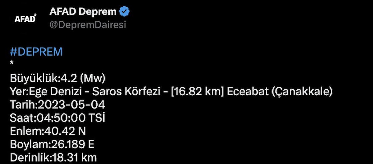 Afet ve Acil Durum Yönetimi Başkanlığı'nın (AFAD) açıklamasına göre Ege Denizi Saros Körfezi'nde saat 23.00'te 4.2 büyüklüğünde bir sarsıntı yaşandı.