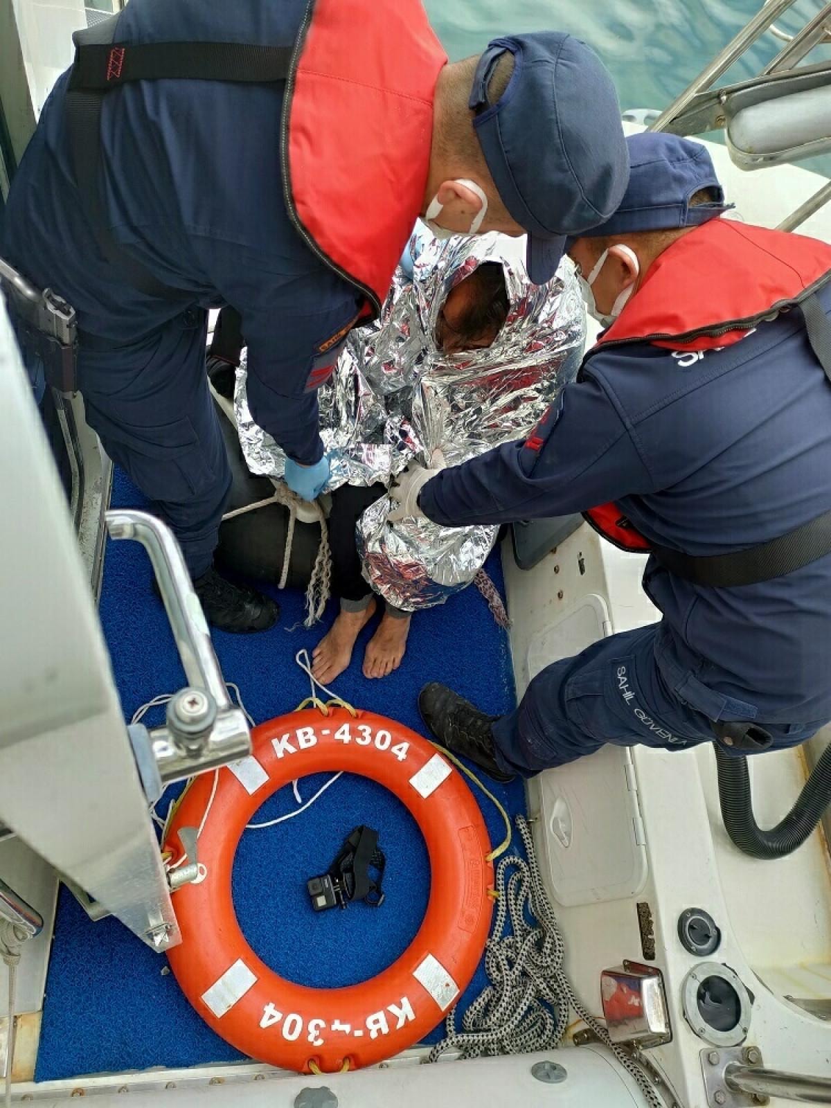 Bölgeye ulaşan Sahil Güvenlik botları 'TCSG-6' ve 'KB-4304', yüzerek yasa dışı geçiş yapmaya çalışan göçmeni kurtardı.