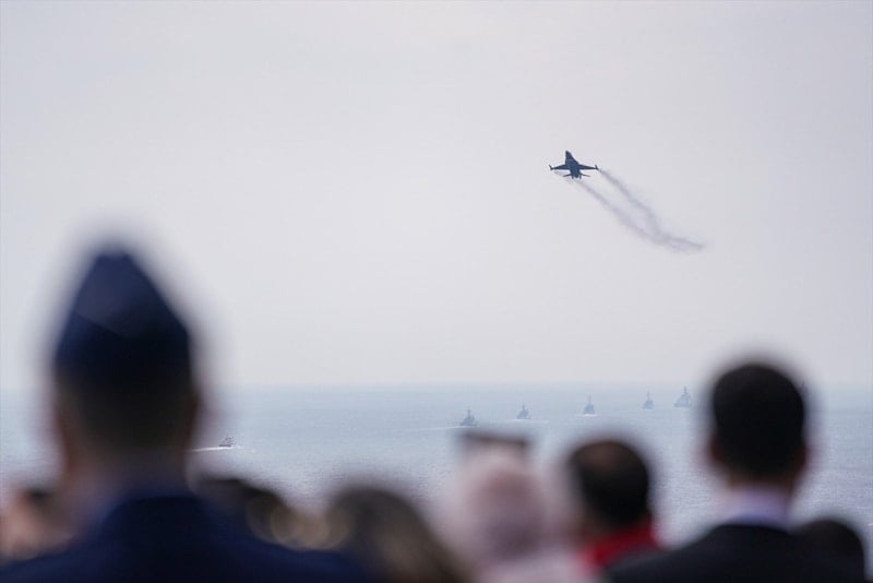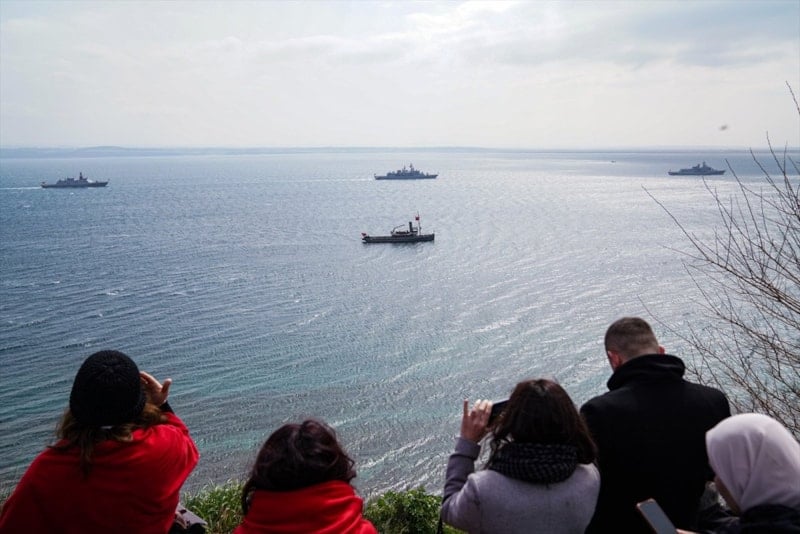 Çanakkale Boğazı’nda demirli bulunan TCG Kınalıada korvetinden 21 pare top atışı yapıldı. Türk Hava Kuvvetleri akrobasi timi “SOLOTÜRK” gösteri uçuşu gerçekleştirdi. Deniz Kuvvetleri Komutanlığı unsurları da Boğaz’da resmi geçit yaptı.