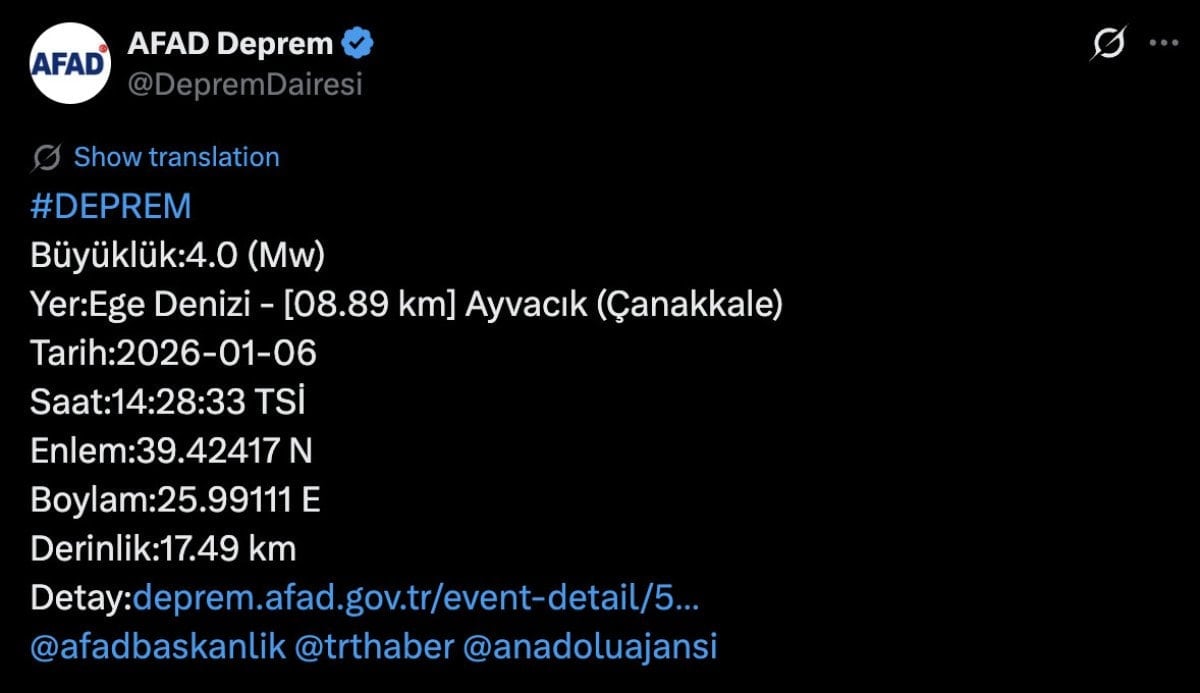- Çanakkale'nin Ayvacık ilçesinde 4.0 büyüklüğünde deprem meydana geldi.