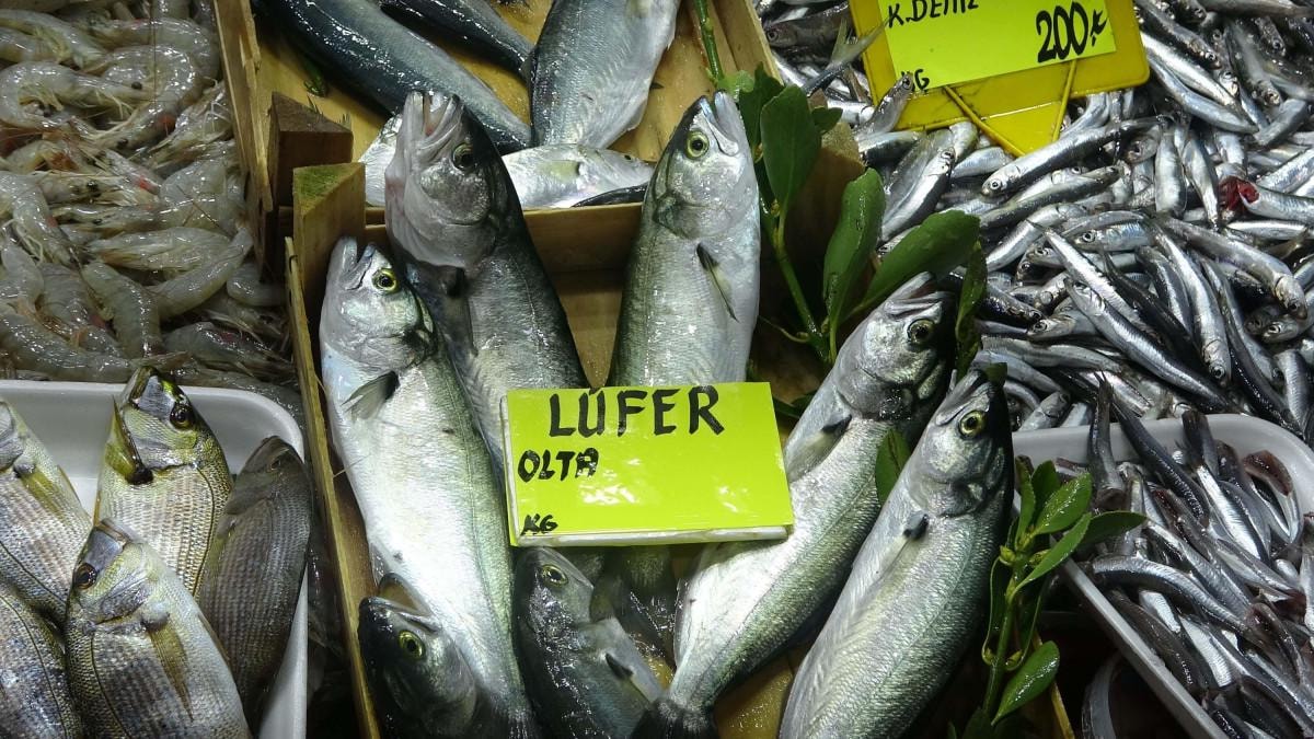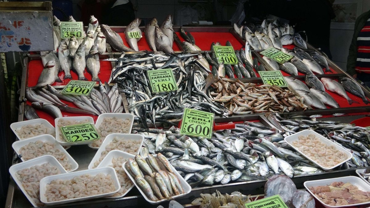 Balıkhanede lüfer 900, sardalya 100, istavrit 120, çinekop 600, kupa 130, levrek 350, tekir 350, çipura 300, zargana 180, mezgit 350, uskumru ise 400 TL'den satılıyor.