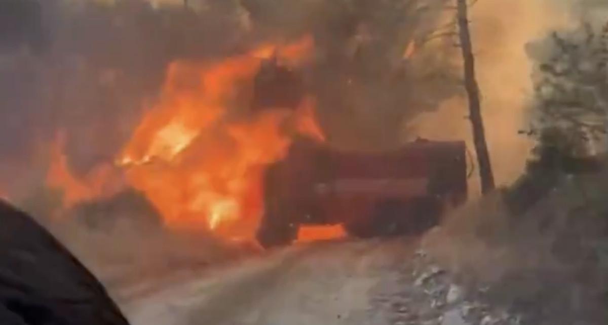 Alevler itfaiye aracının üzerine gelirken dar alanda manevra yapamayan aracı terk eden ekipler koşarak bölgeden uzaklaştı.