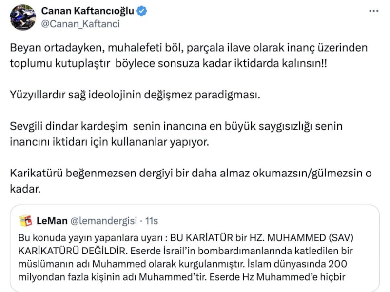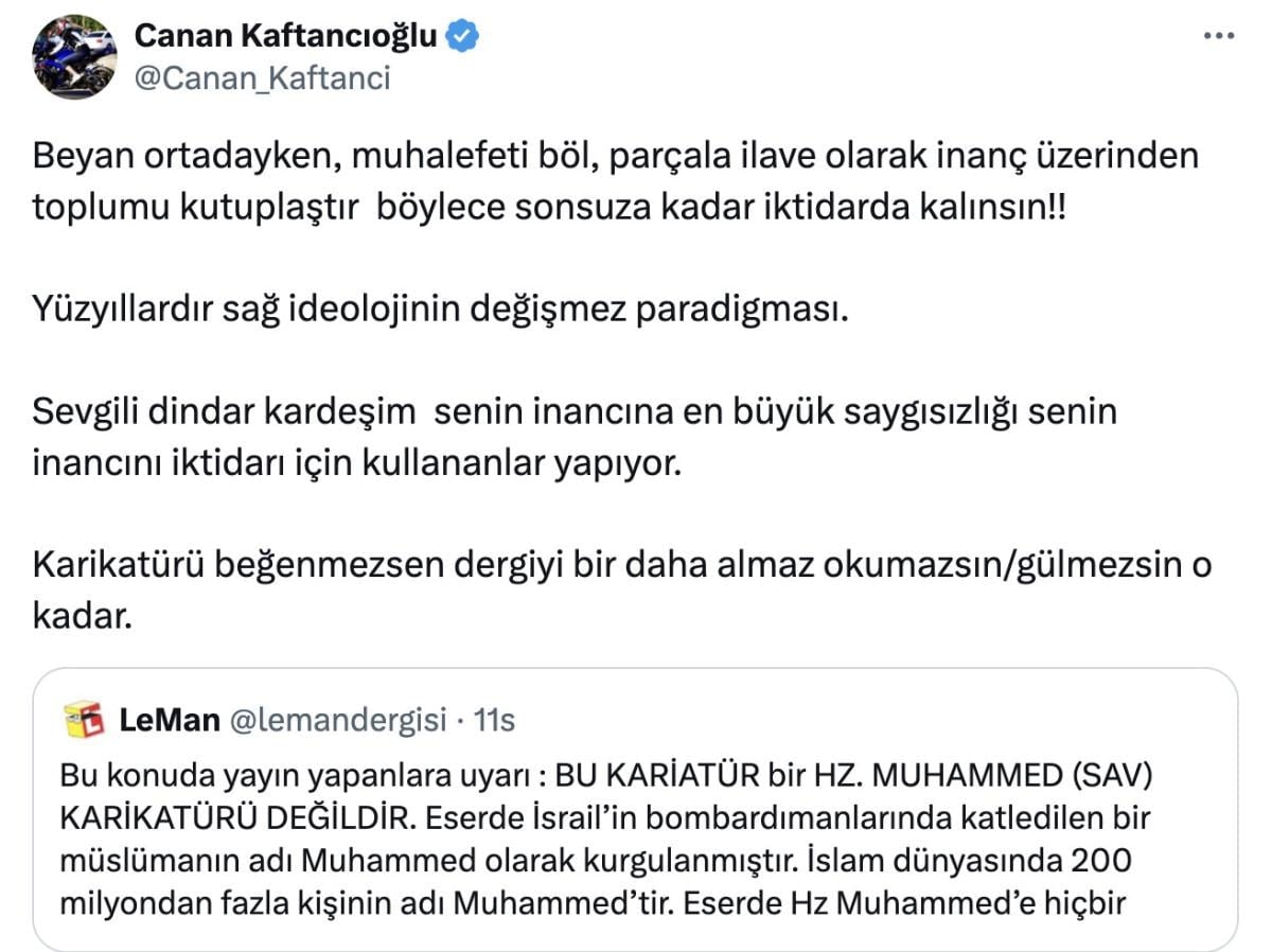 Kaftancıoğlu, açıklamasını "Karikatürü beğenmezsen dergiyi bir daha almaz okumazsın/gülmezsin o kadar." diyerek sonlandırdı.