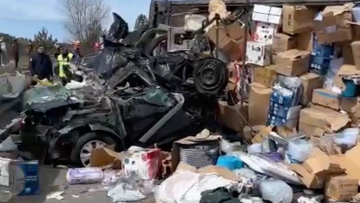Tırın devrilmesi sonucunda ezilen araçta bulunan 4 kişi hayatını kaybetti.
