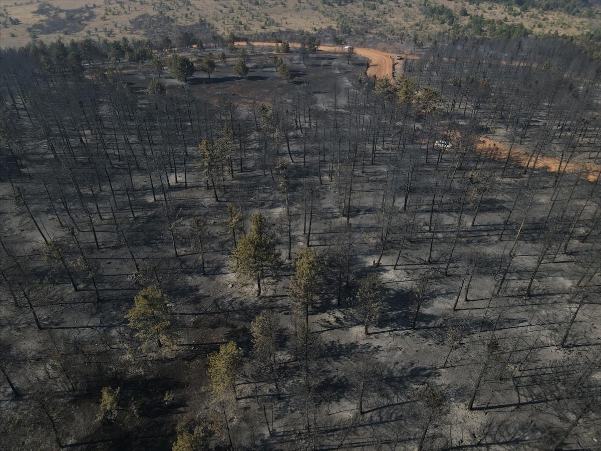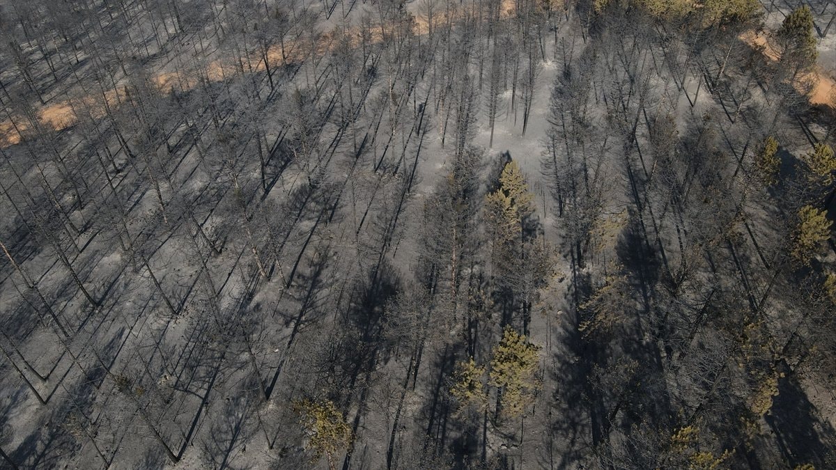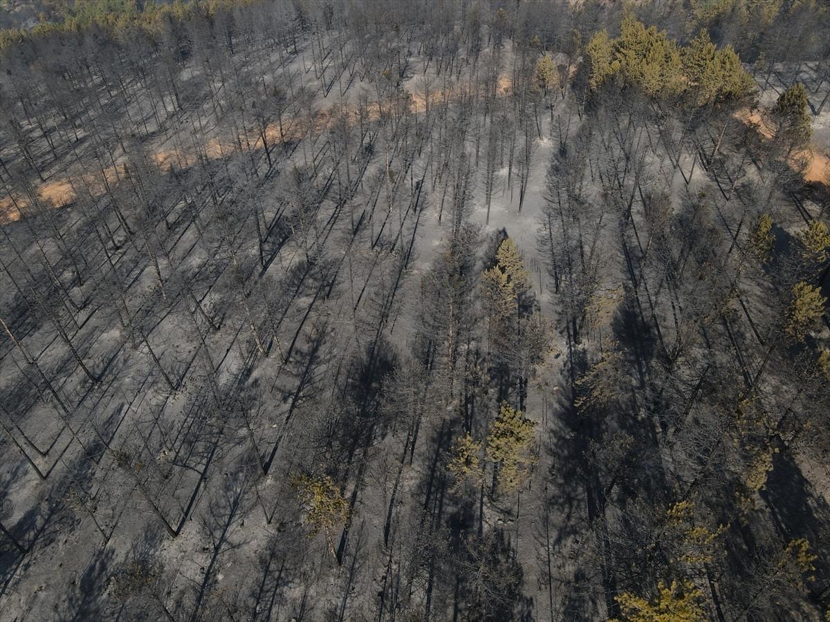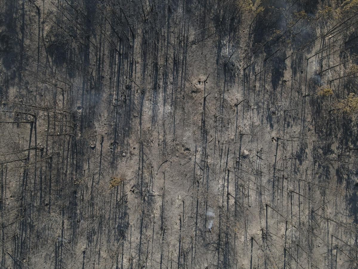 Kaydedilen görüntülerde, geniş bir alanın tamamen siyaha büründüğü ve yeşil örtünün yerini kül tabakasına bıraktığı görüldü.