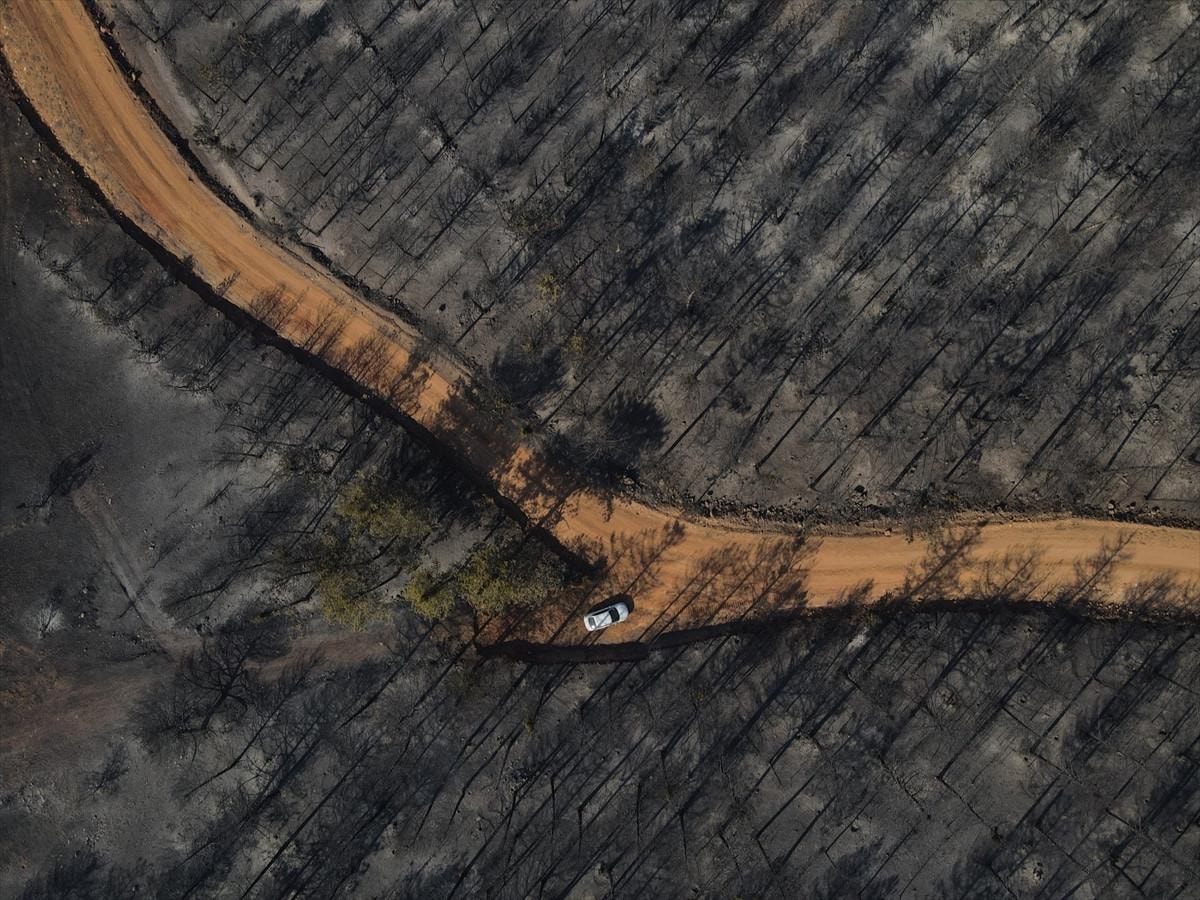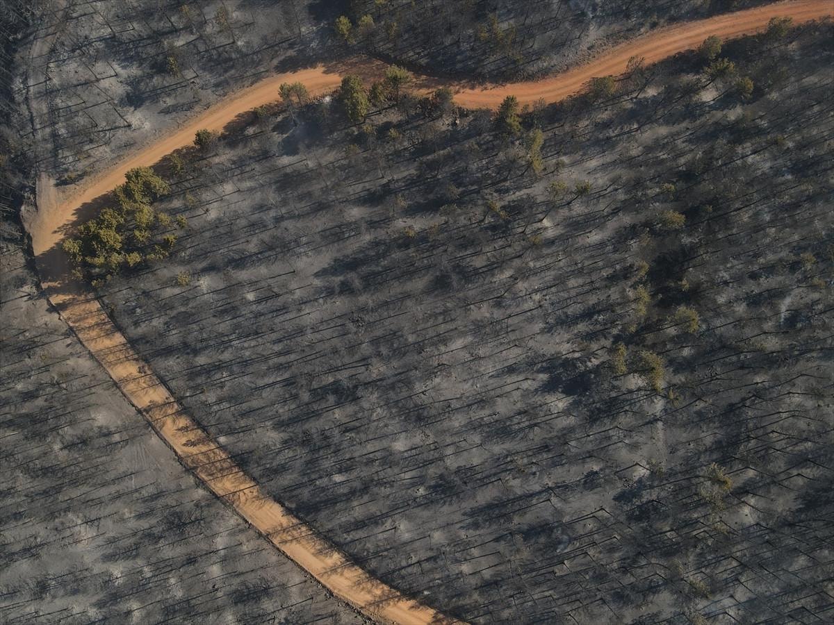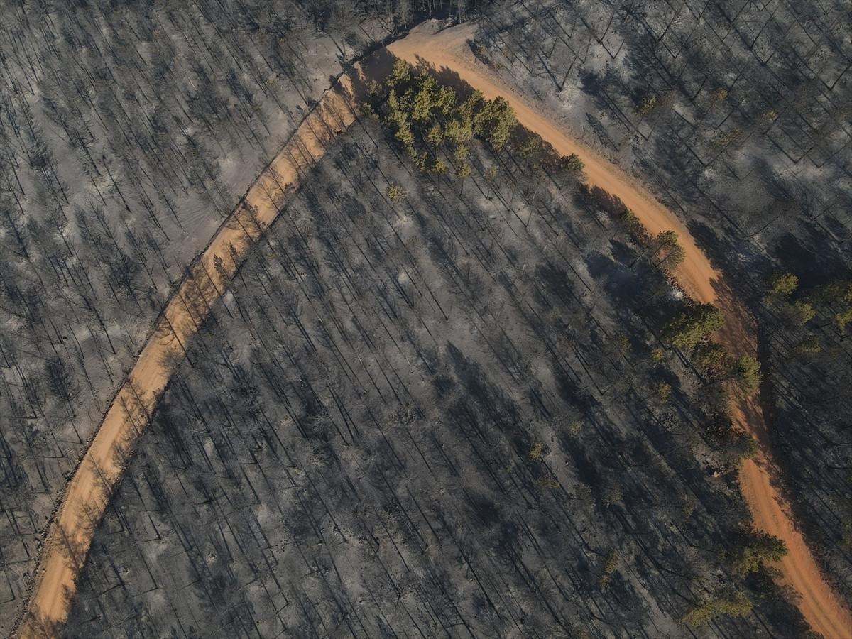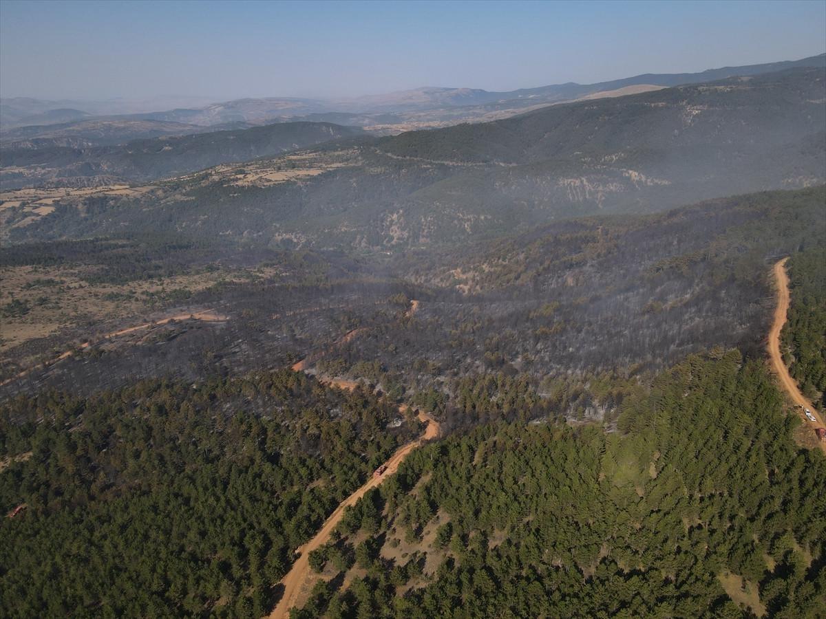Kaydedilen görüntülerde, geniş bir alanın tamamen siyaha büründüğü ve yeşil örtünün yerini kül tabakasına bıraktığı görüldü.