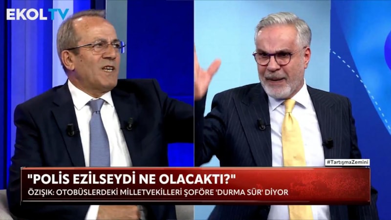 CHP'li vekilleri taşıyan otobüs şoförünün, polisin "dur" ihtarına uymayıp aracı sürmeye devam etmesiyle ilgili görüntülerin tartışıldığı canlı yayında ortalık bir anda gerildi.