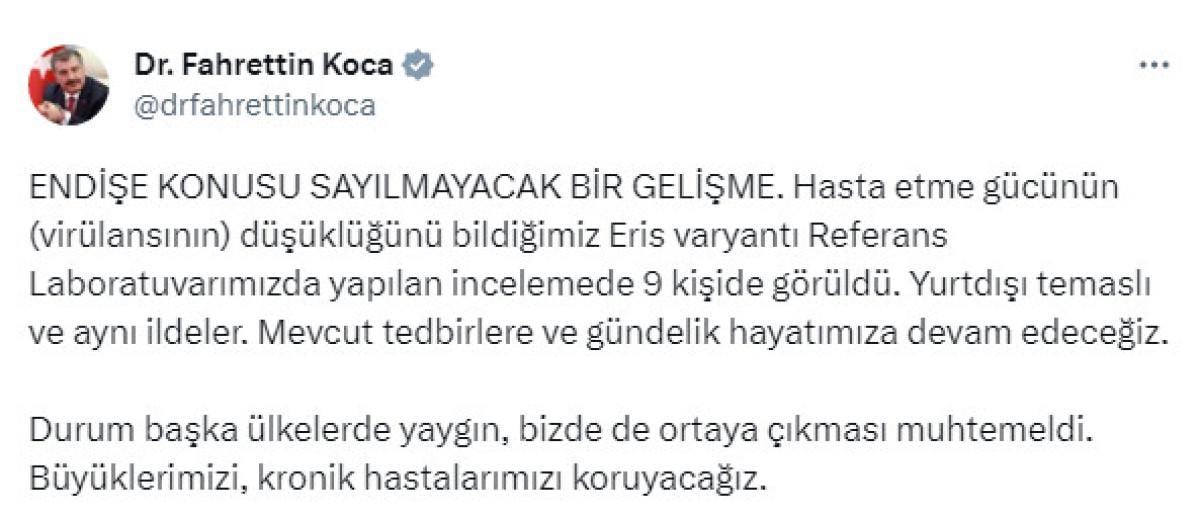 Endişelenecek bir şey olmadığını söyleyen Bakan Koca, "ENDİŞE KONUSU SAYILMAYACAK BİR GELİŞME. Hasta etme gücünün (virülansının) düşüklüğünü bildiğimiz Eris varyantı Referans Laboratuvarımızda yapılan incelemede 9 kişide görüldü. Yurtdışı temaslı ve aynı ildeler. Mevcut tedbirlere ve gündelik hayatımıza devam edeceğiz. Durum başka ülkelerde yaygın, bizde de ortaya çıkması muhtemeldi. Büyüklerimizi, kronik hastalarımızı koruyacağız." dedi.