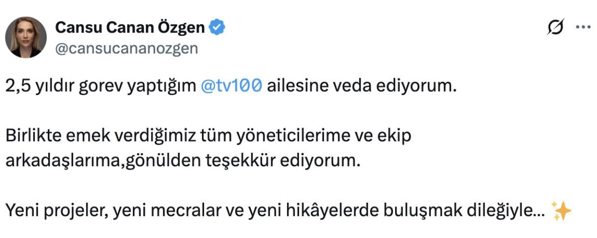 - Cansu Canan Özgen, tv100'den ayrıldığını duyurdu.