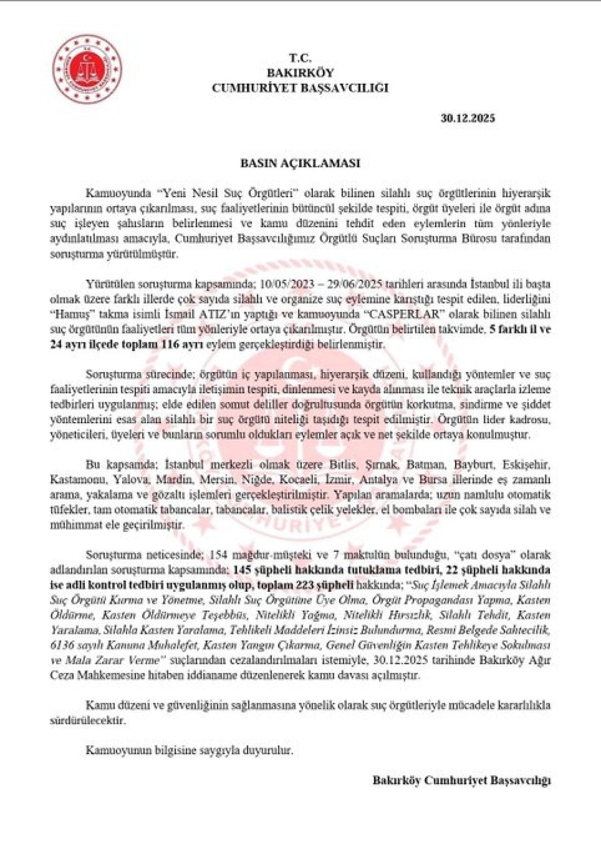 - Bakırköy Cumhuriyet Başsavcılığı, Casperlar adlı suç örgütünün 2023-2025 yılları arasında 116 eylem gerçekleştirdiğini tespit etti.