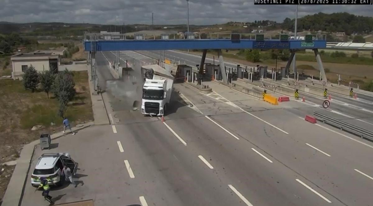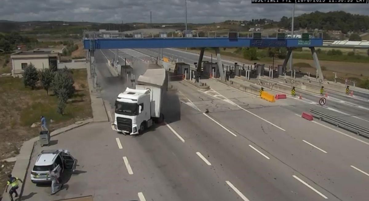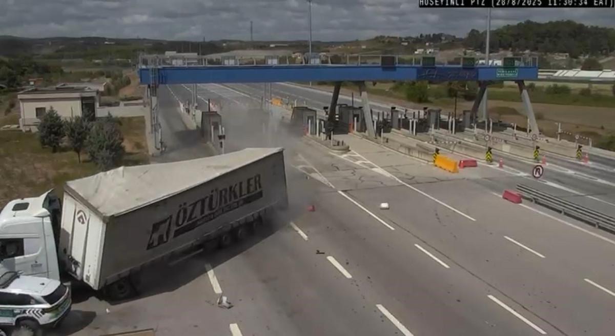 Güvenlik kamerasına yansıyan görüntülerde ise tırın gişelere yaklaşırken kontrolden çıktığı, önce gişelere ardından da jandarma aracına çarptığı görüldü.