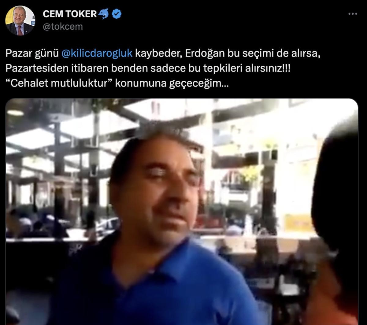 Paylaşımına siyasetle ve günlük olaylarla ilgisiz bir vatandaşın görüntülerini ekleyen Toker, "Pazar günü Kemal Kılıçdaroğlu kaybeder, Erdoğan bu seçimi de alırsa, Pazartesiden itibaren benden sadece bu tepkileri alırsınız!!! “Cehalet mutluluktur” konumuna geçeceğim…" ifadelerine yer verdi.