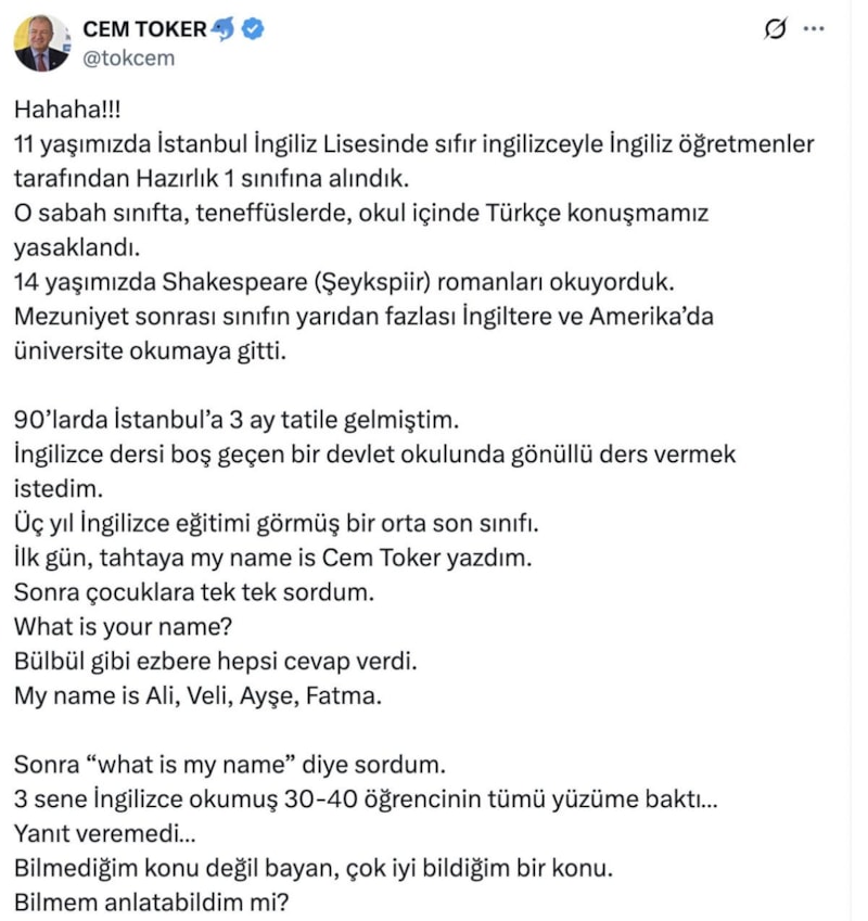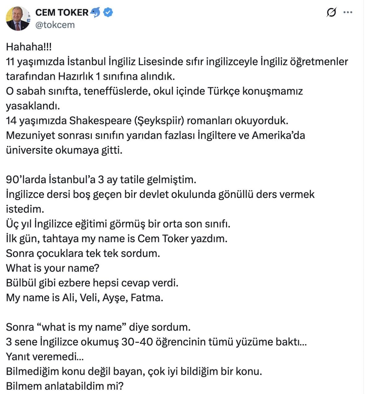 Üç yıl İngilizce eğitimi görmüş bir orta son sınıfı. İlk gün, tahtaya my name is Cem Toker yazdım. Sonra çocuklara tek tek sordum. What is your name? Bülbül gibi ezbere hepsi cevap verdi.