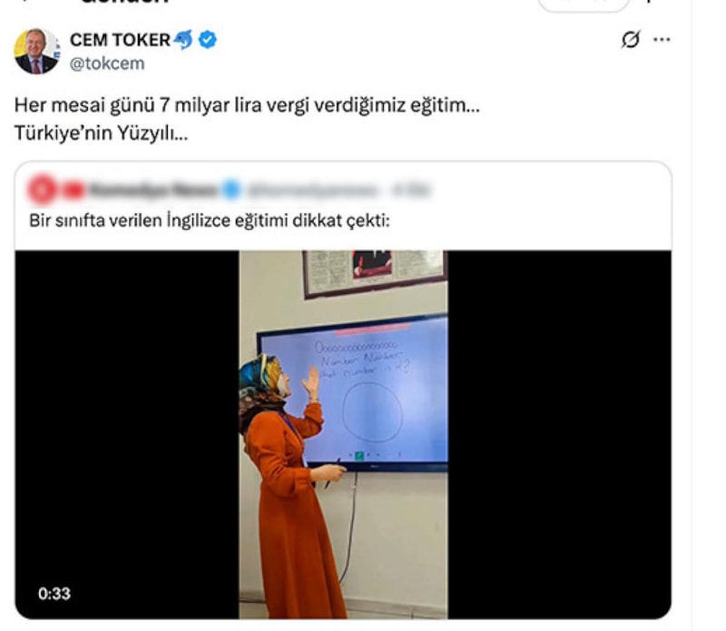 Liberal Demokrat Parti eski Genel Başkanı Cem Toker, şarkıyla İngilizce öğreten tesettürlü öğretmenin videosunu paylaşarak "Her mesai günü 7 milyar lira vergi verdiğimiz eğitim, Türkiye’nin Yüzyıl" notunu düştü. Kendisine tepki gösterenler ise "Bilmediğim bir konu değil" diyerek yanıt verdi.