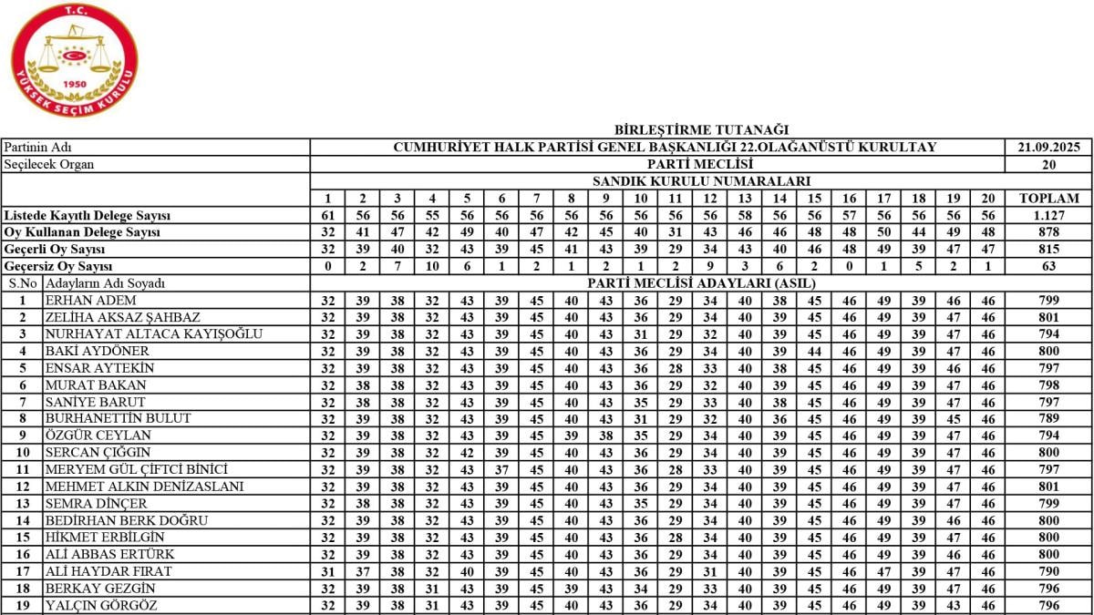 Kurultayda genel başkan seçimi için oy kullanma işleminin tamamlanmasının ardından delegeler, 60 kişilik PM ve 15 kişilik YDK listelerini oyladı. Saat 16.00'da biten oy kullanma işleminde delegeler, Genel Başkan Özgür Özel'in Parti Meclisi için Kurultay Başkanlık Divanı'na sunduğu blok listeyi oyladı.