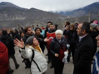 Yaklaşık bir kilometrelik yürüyüşün ardından çevik kuvvet ekiplerinin Artvin Devlet Hastanesi önünde yolu barikatla kapattığını fark eden gruptakiler, burada bir saat kadar bekledi.
