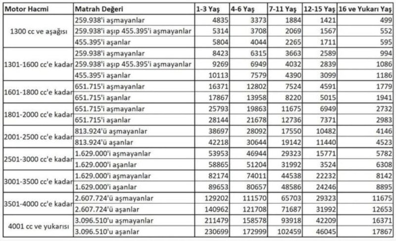 En yaygın kullanılan silindir hacmi 1301 – 1600 arası yeni otomobillerde en düşük Motorlu Taşıtlar Vergisi (MTV) de 5 bin 851 liradan 8 bin 421 liraya çıktı. Otomobillerde uygulanan muayene ücreti 1821 liradan 2 bin 621 liraya yükseldi.