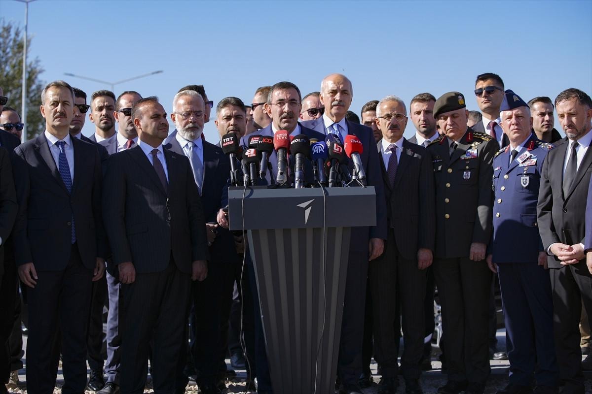 TBMM Başkanı Numan Kurtulmuş ve Cumhurbaşkanı Yardımcısı Cevdet Yılmaz, TUSAŞ'ın Kahramankazan'daki yerleşkesinde düzenledikleri basın toplantısında dünkü terör saldırısına ilişkin dikkat çeken açıklamalarda bulundu.