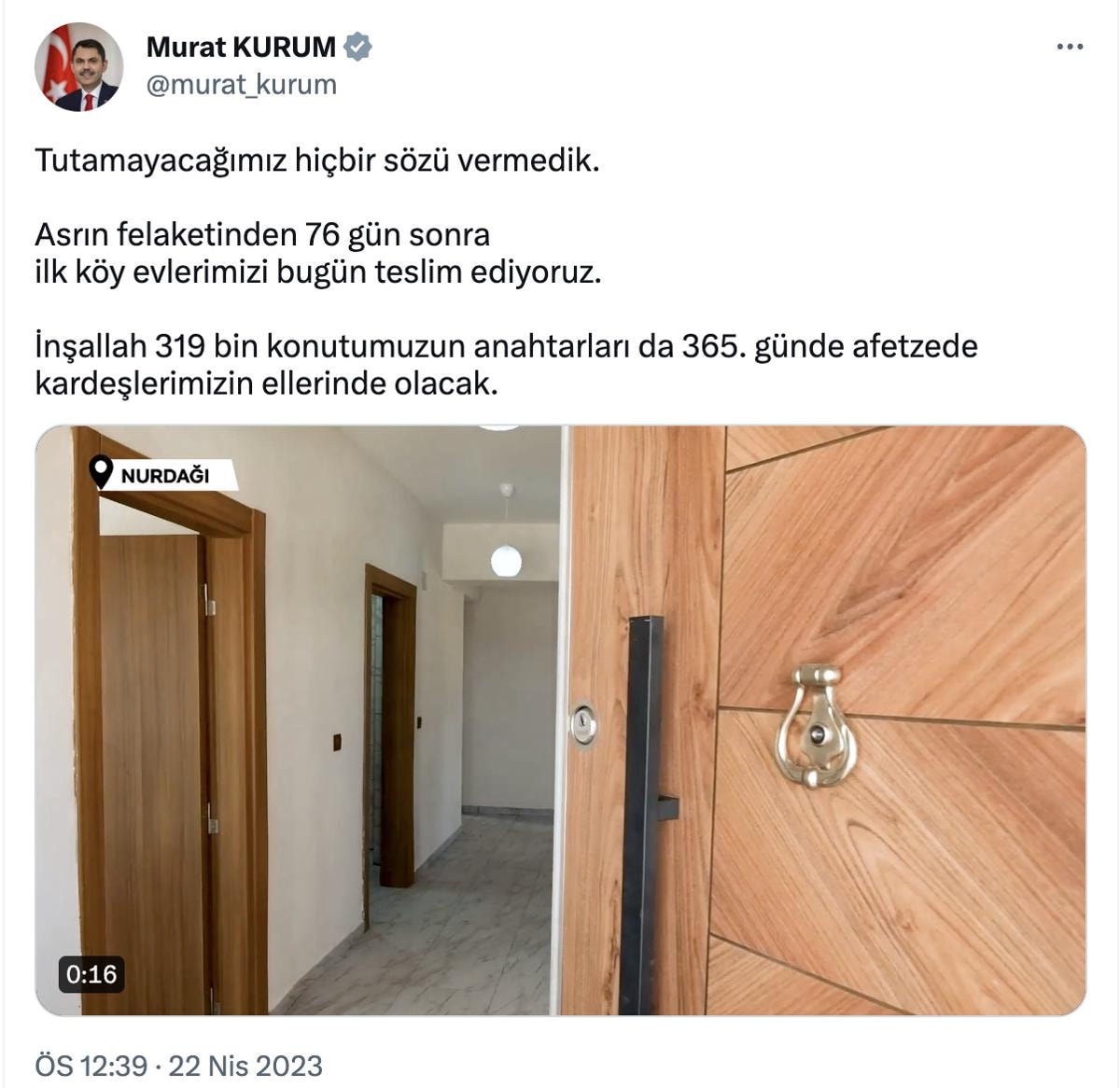 Çevre, Şehircilik ve İklim Değişikliği Bakanı Murat Kurum, Twitter'da yayınladığı mesajında "Tutamayacağımız hiçbir sözü vermedik" diyerek şu ifadeyi kullandı: