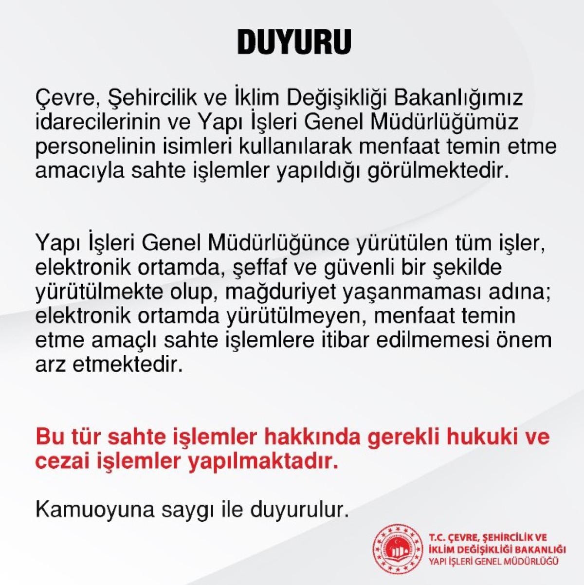“Çevre, Şehircilik ve İklim Değişikliği Bakanlığımız idarecilerinin ve Yapı İşleri Genel Müdürlüğümüz personelinin isimleri kullanılarak menfaat temin etme amacıyla sahte işlemler yapıldığı görülmektedir. Yapı İşleri Genel Müdürlüğünce yürütülen tüm işler elektronik ortamda, şeffaf ve güvenli bir şekilde yürütülmekte olup, mağduriyet yaşanmaması adına; elektronik ortamda yürütülmeyen, menfaat temin etme amaçlı sahte işlemlere itibar edilmemesi önem arz etmektedir. Bu tür sahte işlemler hakkında gerekli hukuki ve cezai işlemler yapılmaktadır. Kamuoyuna saygı ile duyurulur.”