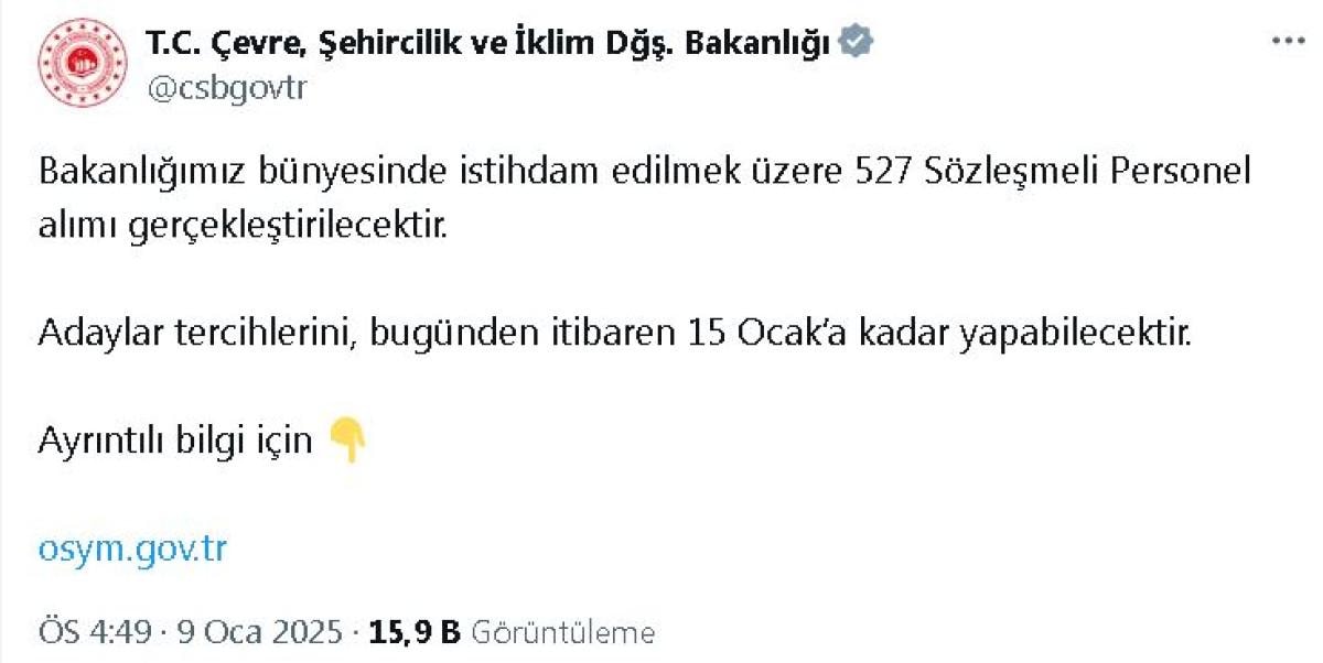 Çevre, Şehircilik ve İklim Değişikliği Bakanlığı bünyesinde çalışmak isteyenlere müjdeli haber geldi...
