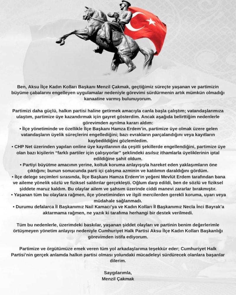 CHP Aksu Kadın Kolları Başkanı Menzil Çakmak, görevinden istifa ettiğini sosyal medya hesabından duyurdu. Çakmak, istifasına gerekçe olarak parti içi usulsüzlük iddialarını, yaşadığı şiddet olaylarını ve ilgisizlik nedeniyle yaşadığı hayal kırıklığını gösterdi.
