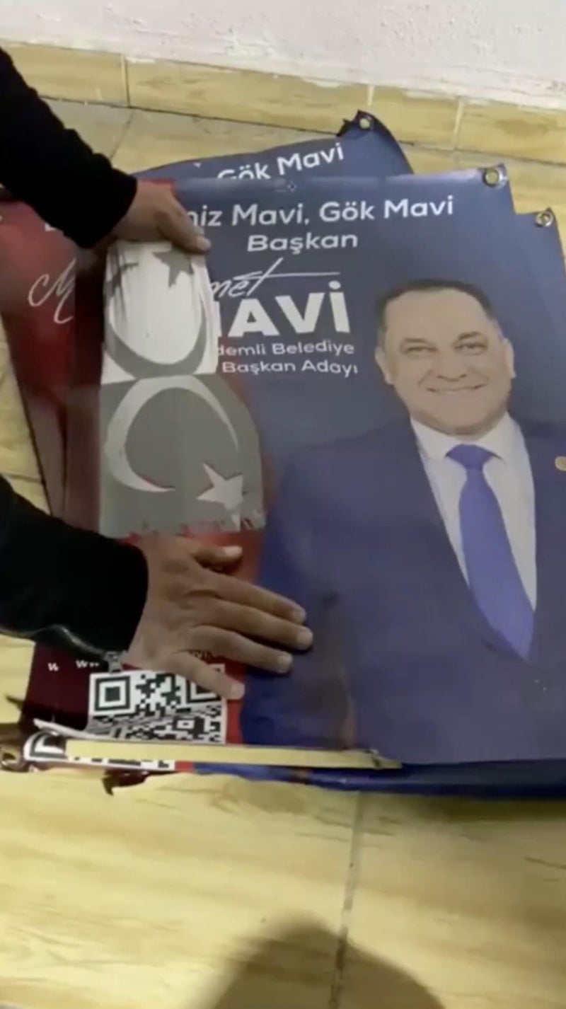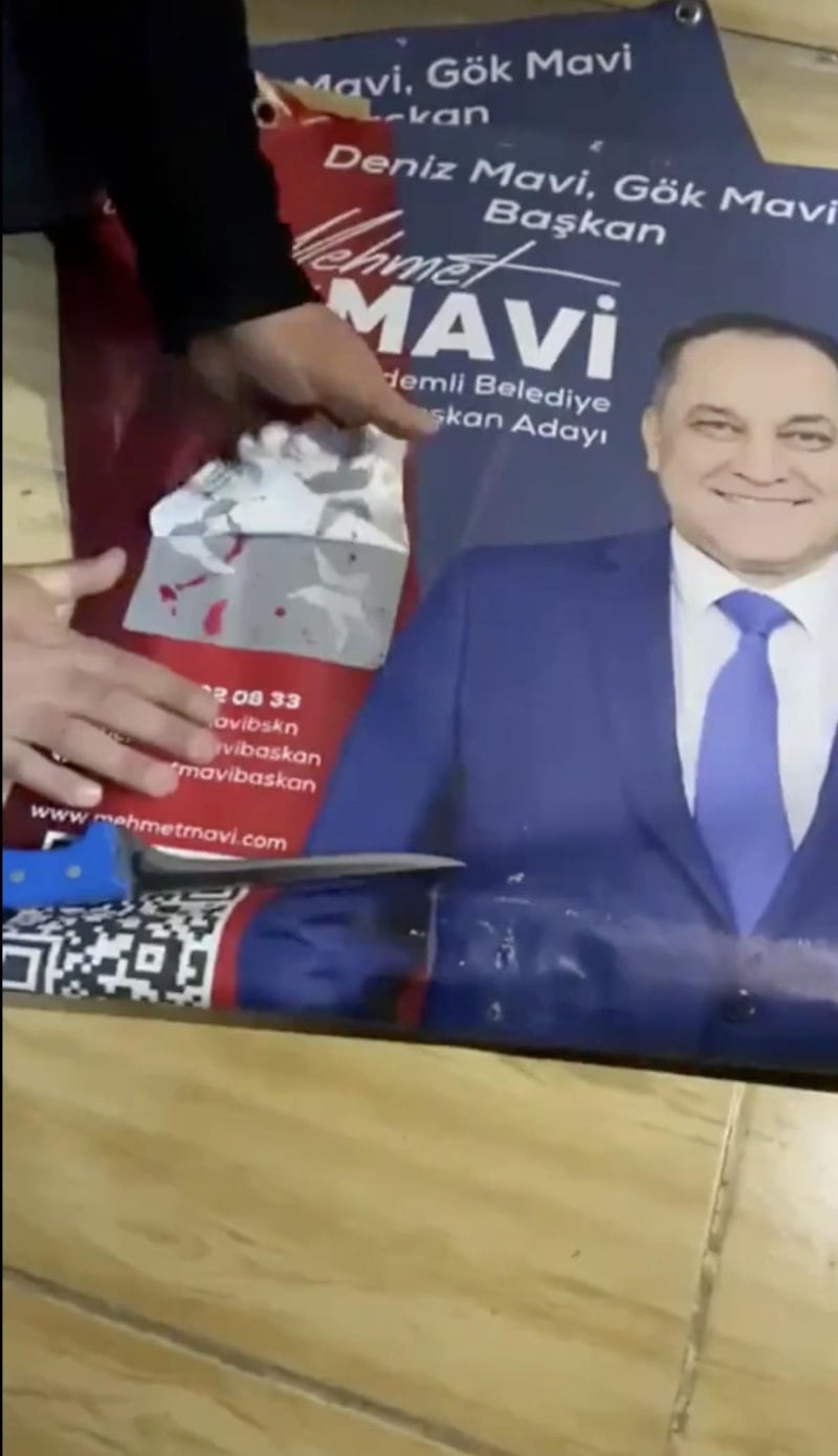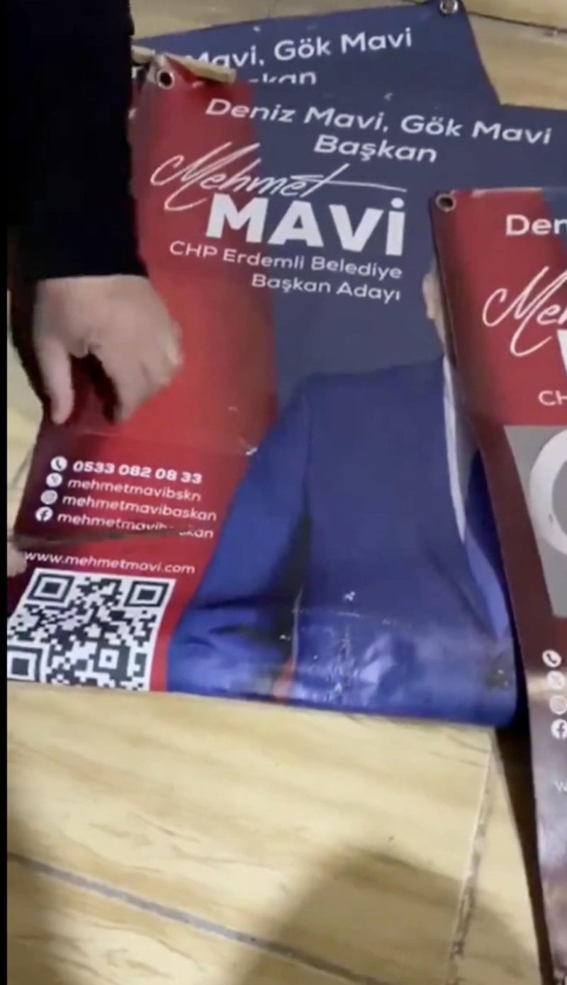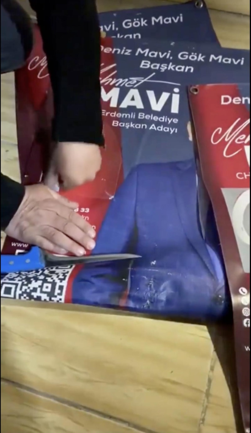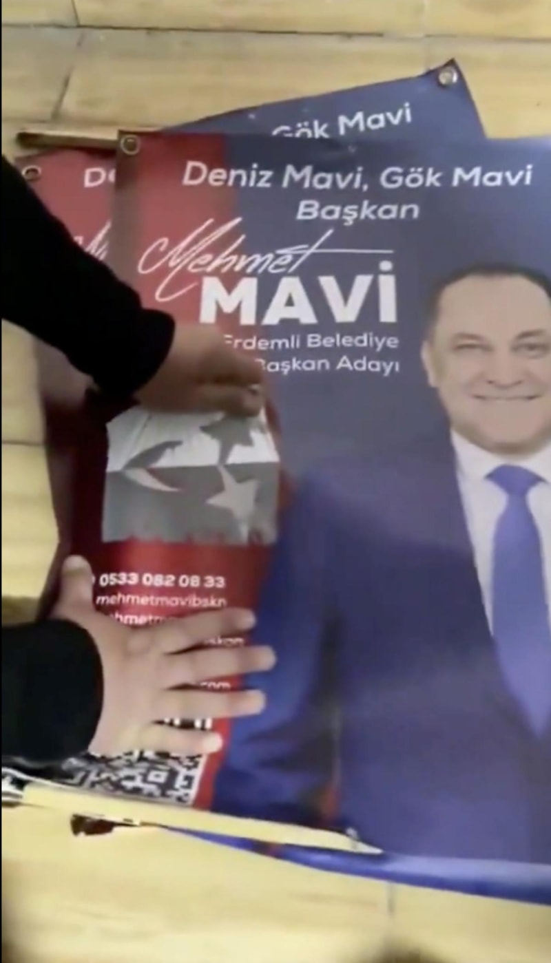 CHP Erdemli Belediye Başkan Adayı Mehmet Mavi'nin kullandıkları afişte, Türk bayraklarının üstünü CHP- DEM ittifakından dolayı kapattığı görüldü.