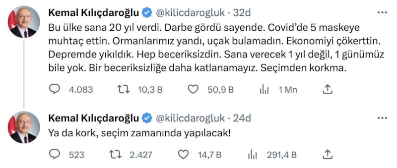 Bu ülke sana 20 yıl verdi. Darbe gördü sayende. Covid'de 5 maskeye muhtaç ettin. Ormanlarımız yandı, uçak bulamadın. Ekonomiyi çökerttin. Depremde yıkıldık. Hep beceriksizdin. Sana verecek 1 yıl değil, 1 günümüz bile yok. Bir beceriksizliğe daha katlanamayız. Seçimden korkma.
