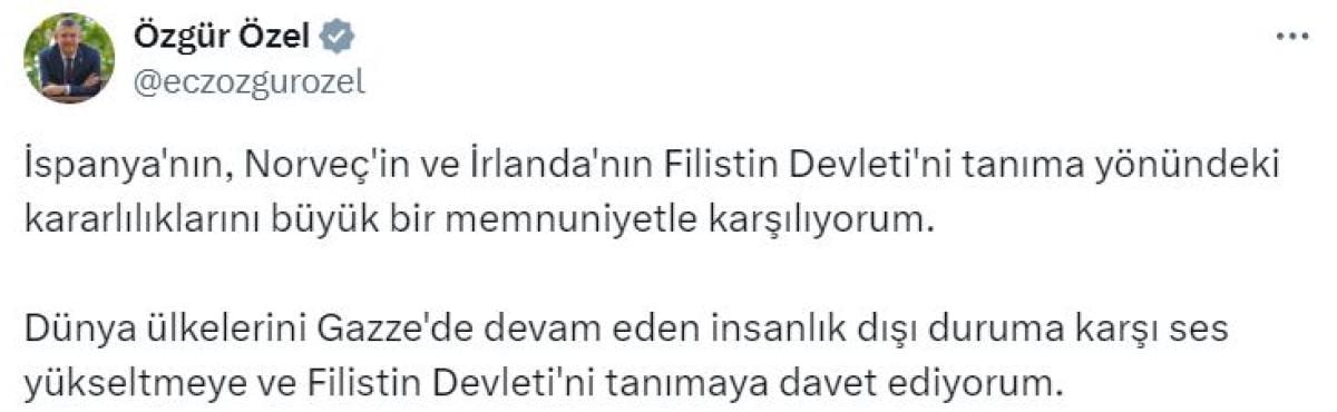 CHP Lideri Özel, Filistin konusunda diğer ülkelerin de aynı adımı atması gerektiğinin altını çizdi.