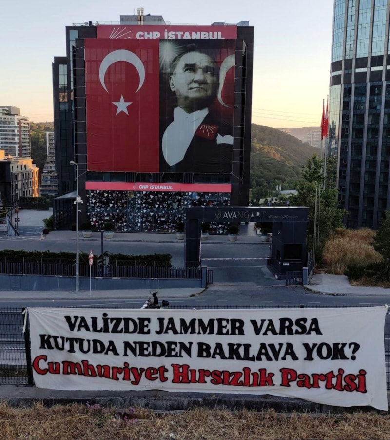 CHP'li belediyelere yönelik yolsuzluk ve rüşvet operasyonuna her geçen gün bir yenisi daha eklenirken CHP İstanbul İl Başkanlığı'nın bulunduğu bölgeye asılan pankart gündem oldu. Pankartta, "Valizde jammer varsa kutuda neden baklava yok, Cumhuriyet Hırsızlık Partisi" ifadeleri yer aldı.
