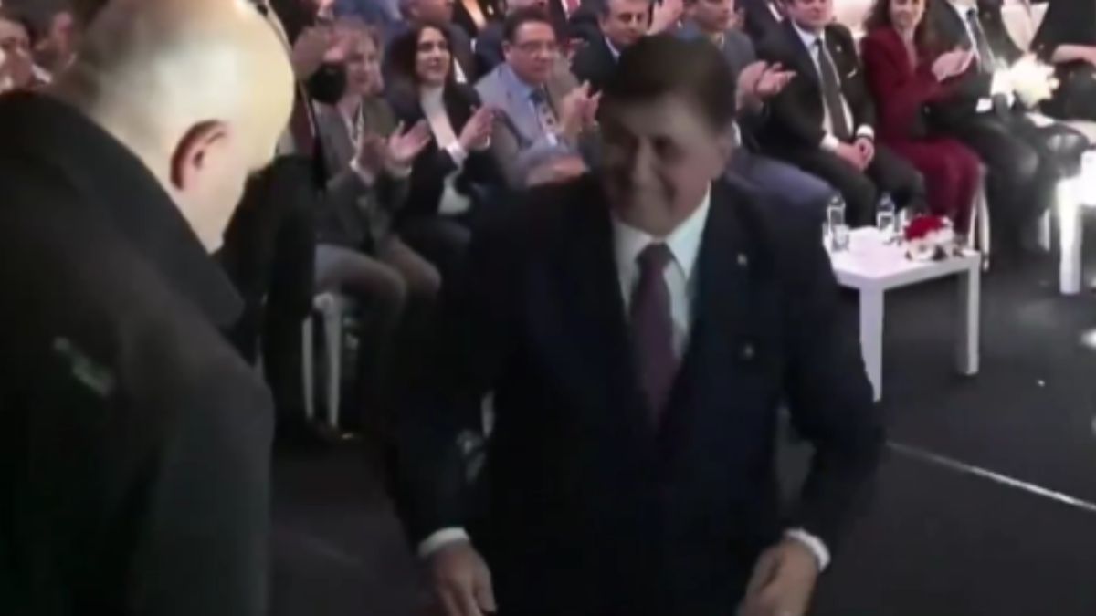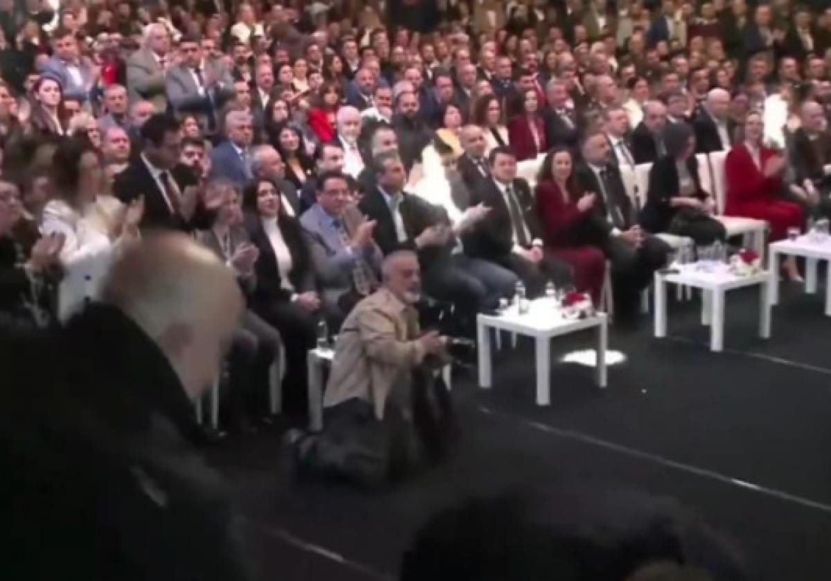 Özel'in daveti üzerine sahneye çıkmak üzere yerinden kalkan Tugay, merdivenleri çıkarken yere düştü.