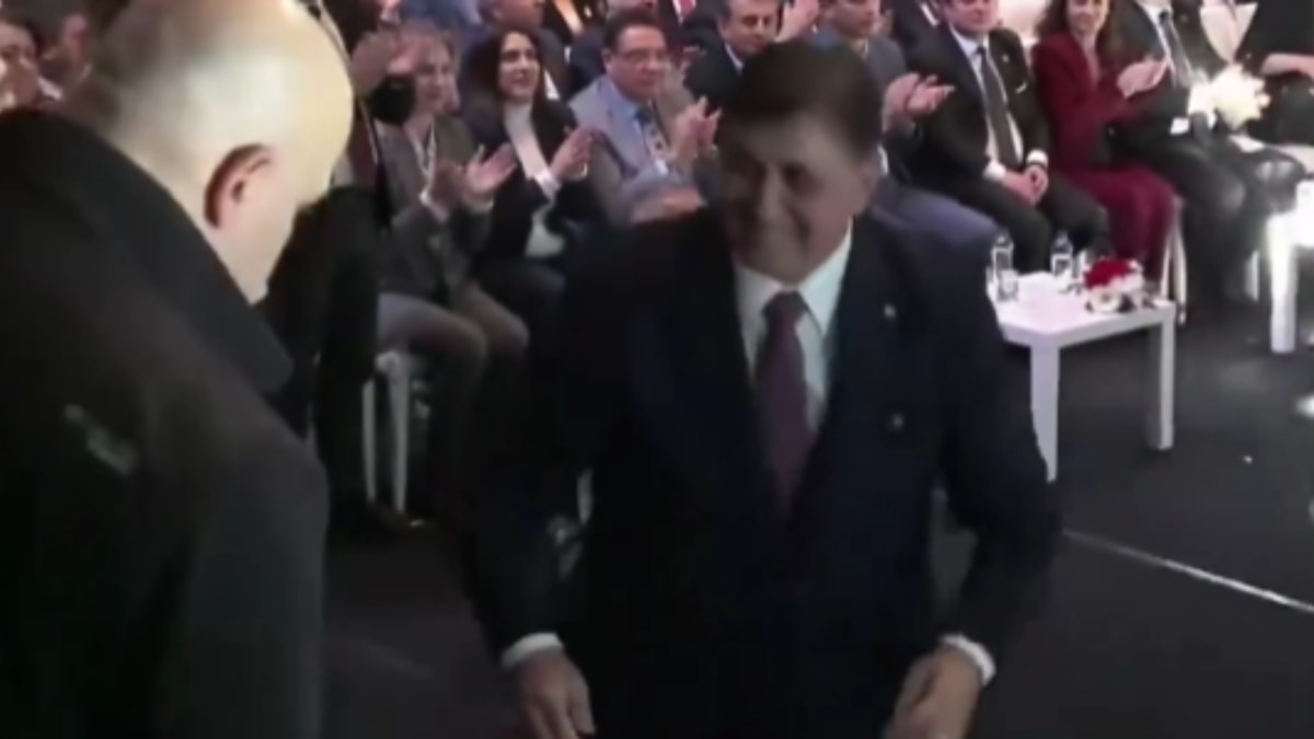 Hızla yerden kaldırılan Tugay, sahneye çıktı ve salondakileri selamladı. O sırada Özgür Özel'in elinde mikrofonla beklemesi ve yardım için herhangi bir hamlede bulunmaması ise dikkati çekti.