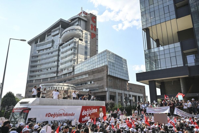 Burada CHP Genel Merkezi'nin önünde, beraberindeki kalabalıkla birlikte Kılıçdaroğlu'nu hedef aldı ve istifa sloganları yükseldi.