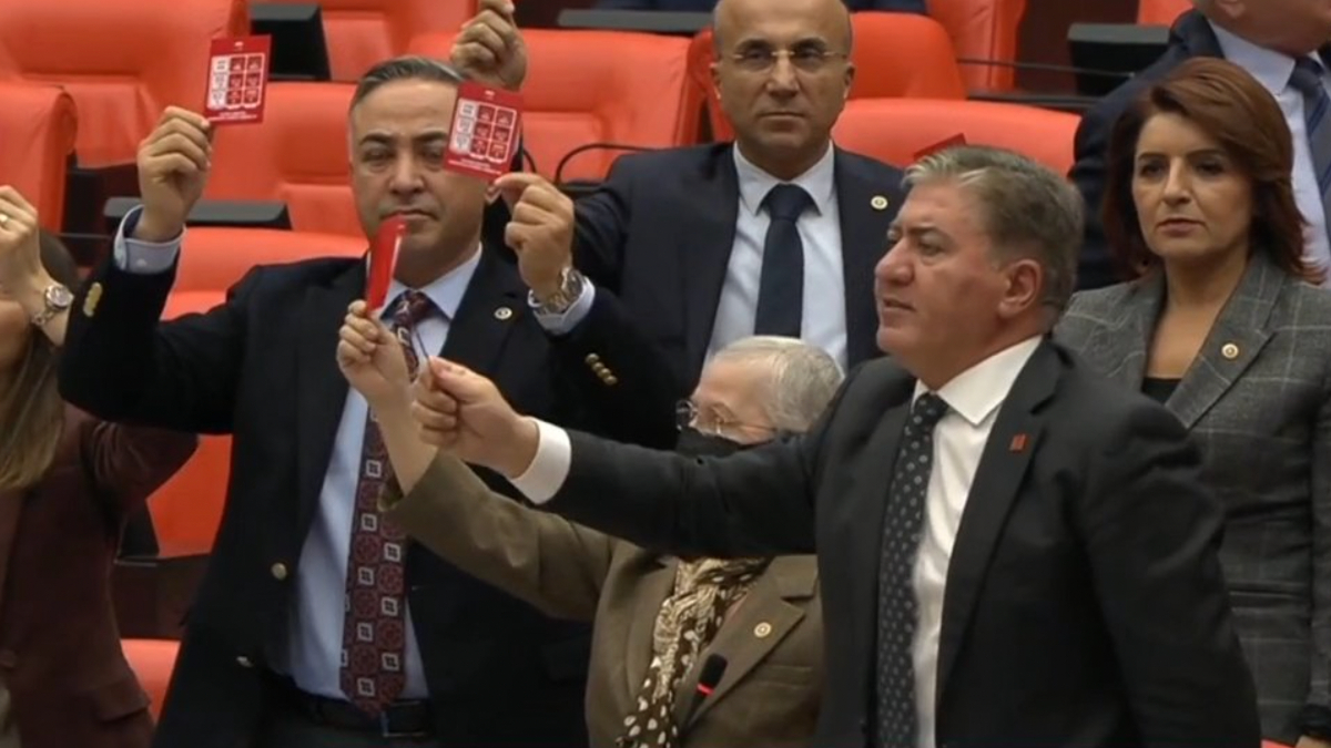 Bunun üzerine bugün CHP TBMM Grubu da konuşma sırasında, Meclis'te kırmızı kart gösterdi.