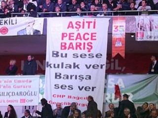 CHP Kurultay salonunda bir pankart sessiz sedasız indirildi. Pankartta Kürtçe 'Barış' (Aşiti) yazıyordu.