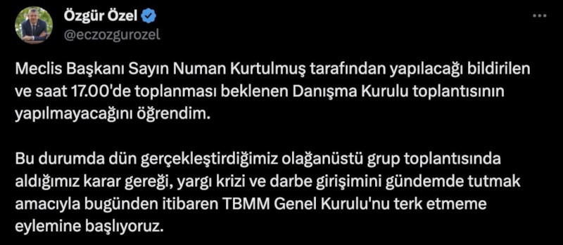 "Meclis Başkanı Sayın Numan Kurtulmuş tarafından yapılacağı bildirilen ve saat 17.00'de toplanması beklenen Danışma Kurulu toplantısının yapılmayacağını öğrendim. Bu durumda dün gerçekleştirdiğimiz olağanüstü grup toplantısında aldığımız karar gereği, yargı krizi ve darbe girişimini gündemde tutmak amacıyla bugünden itibaren TBMM Genel Kurulu'nu terk etmeme eylemine başlıyoruz"