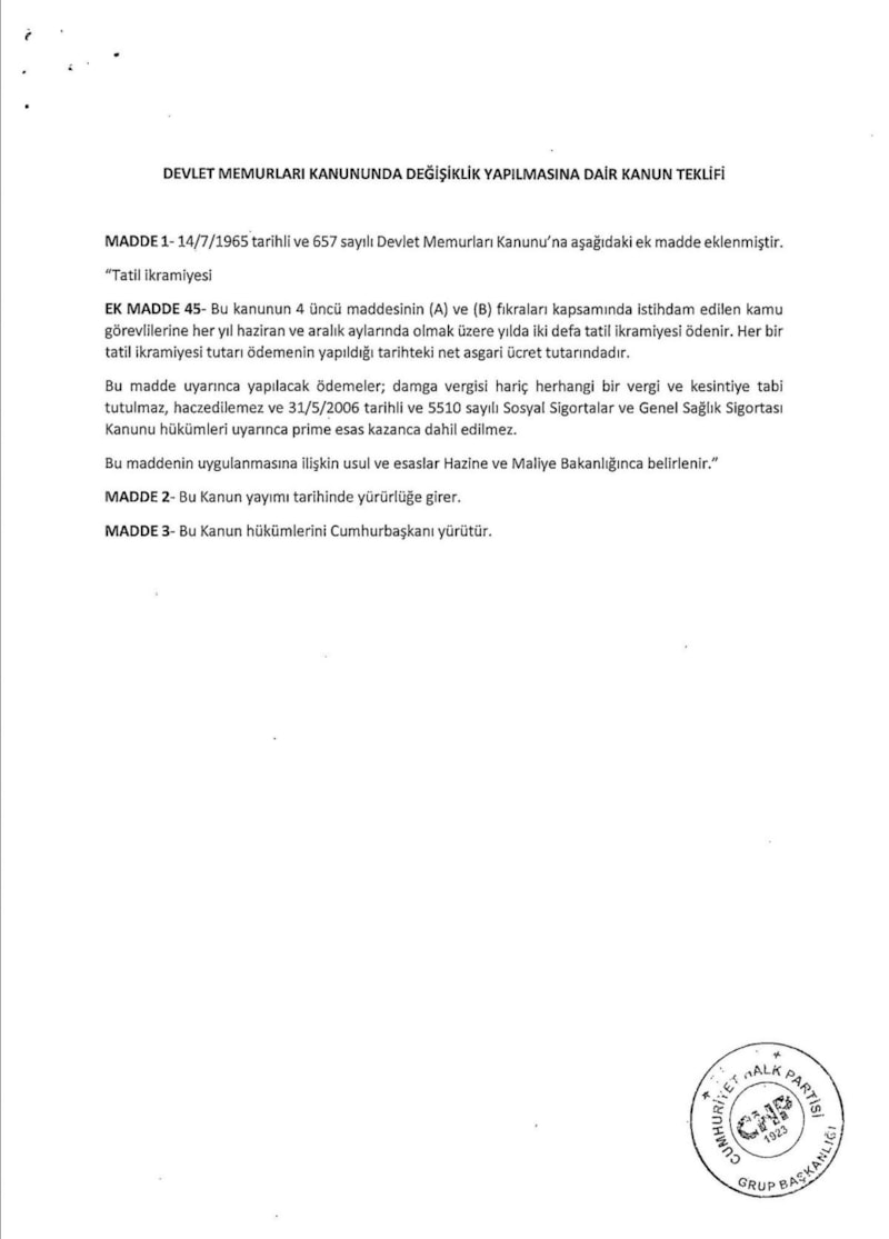 CHP, memurlara yılda 2 kez asgari ücret tutarında ikramiye ödenmesine ilişkin Meclis'e kanun teklifi verdi.
