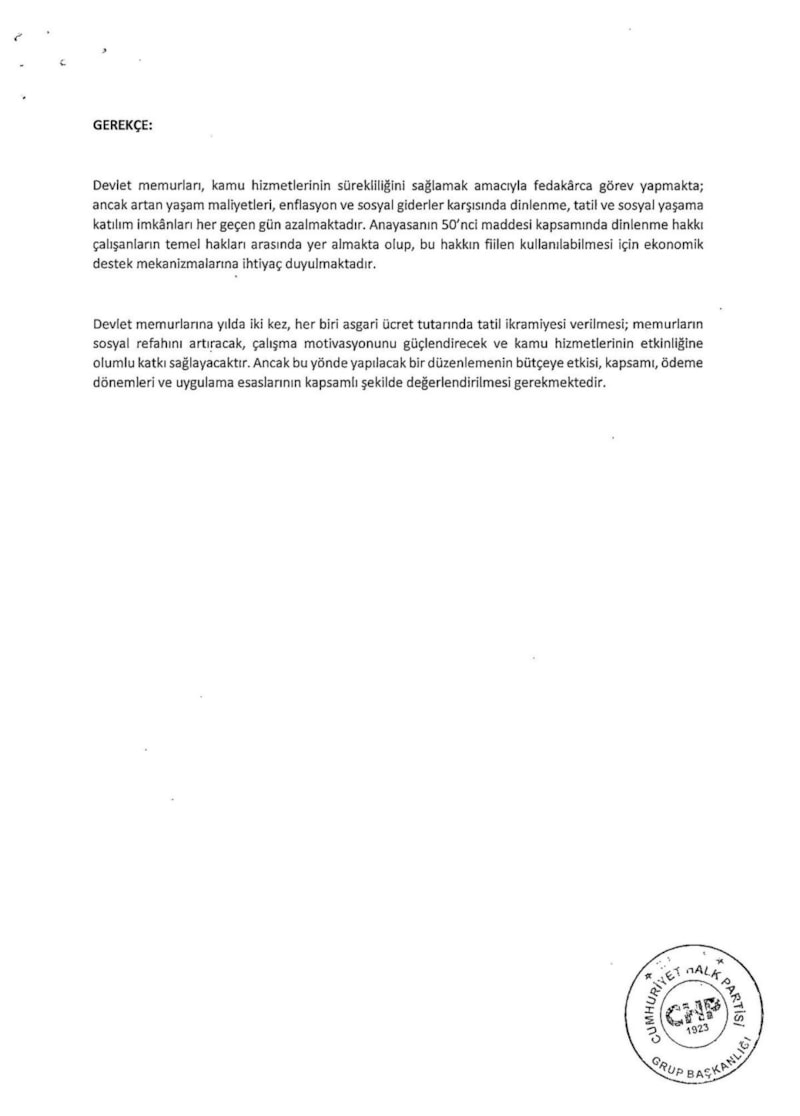 Devlet memurlarına yılda iki kez, her biri asgari ücret tutarında tatil ikramiyesi verilmesi; memurların sosyal refahını artıracak, çalışma motivasyonunu güçlendirecek ve kamu hizmetlerinin etkinliğine olumlu katkı sağlayacaktır.