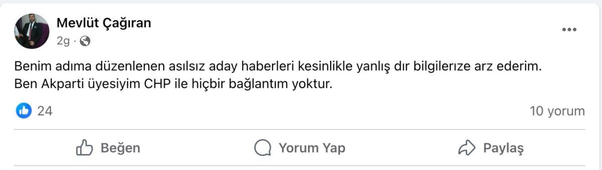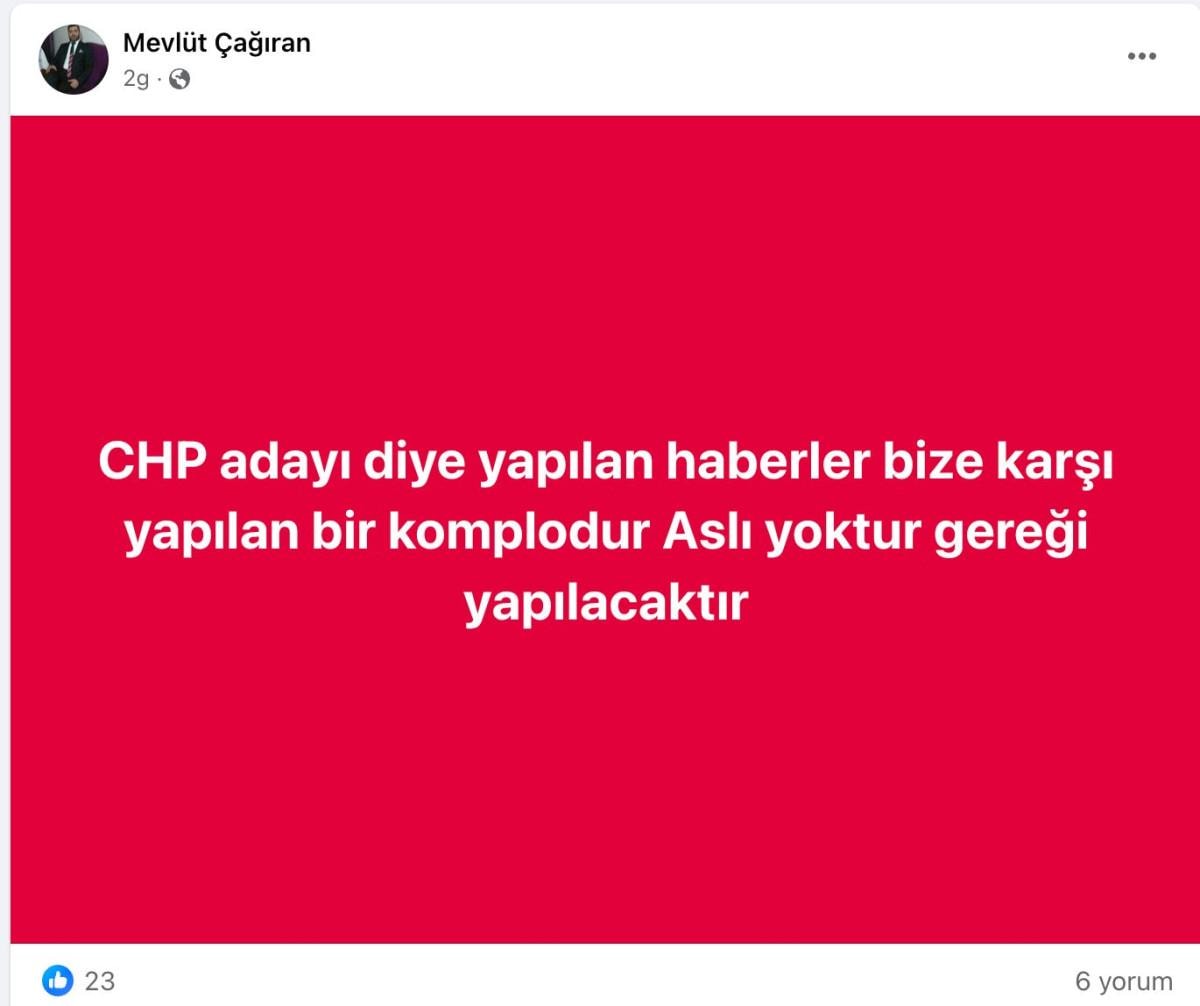 Bir paylaşım daha yapan Mevlüt Çağıran, "CHP adayı diye yapılan haberler bize karşı yapılan bir komplodur, aslı yoktur. Gereği yapılacaktır." deyince CHP çok geçmeden yaptığı yanlıştan geri döndü.