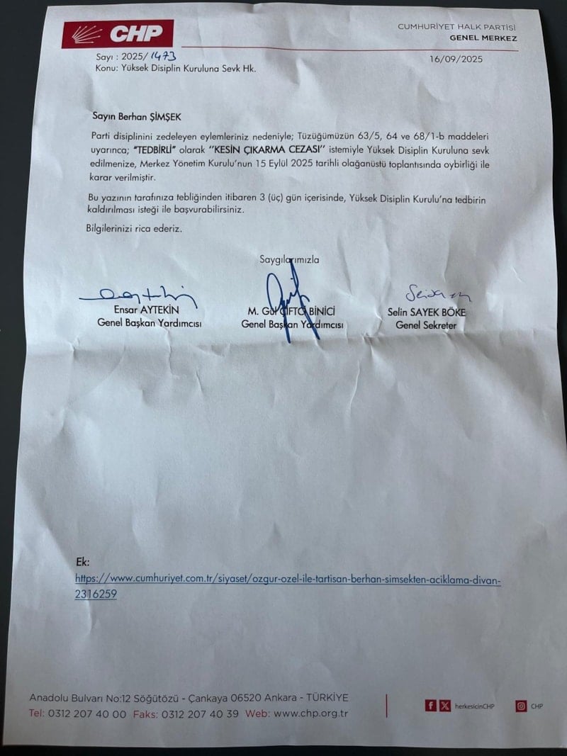 Yaşanan gelişmede, CHP yönetimi, Şimşek'i kesin ihraç talebiyle disipline sevk etti.